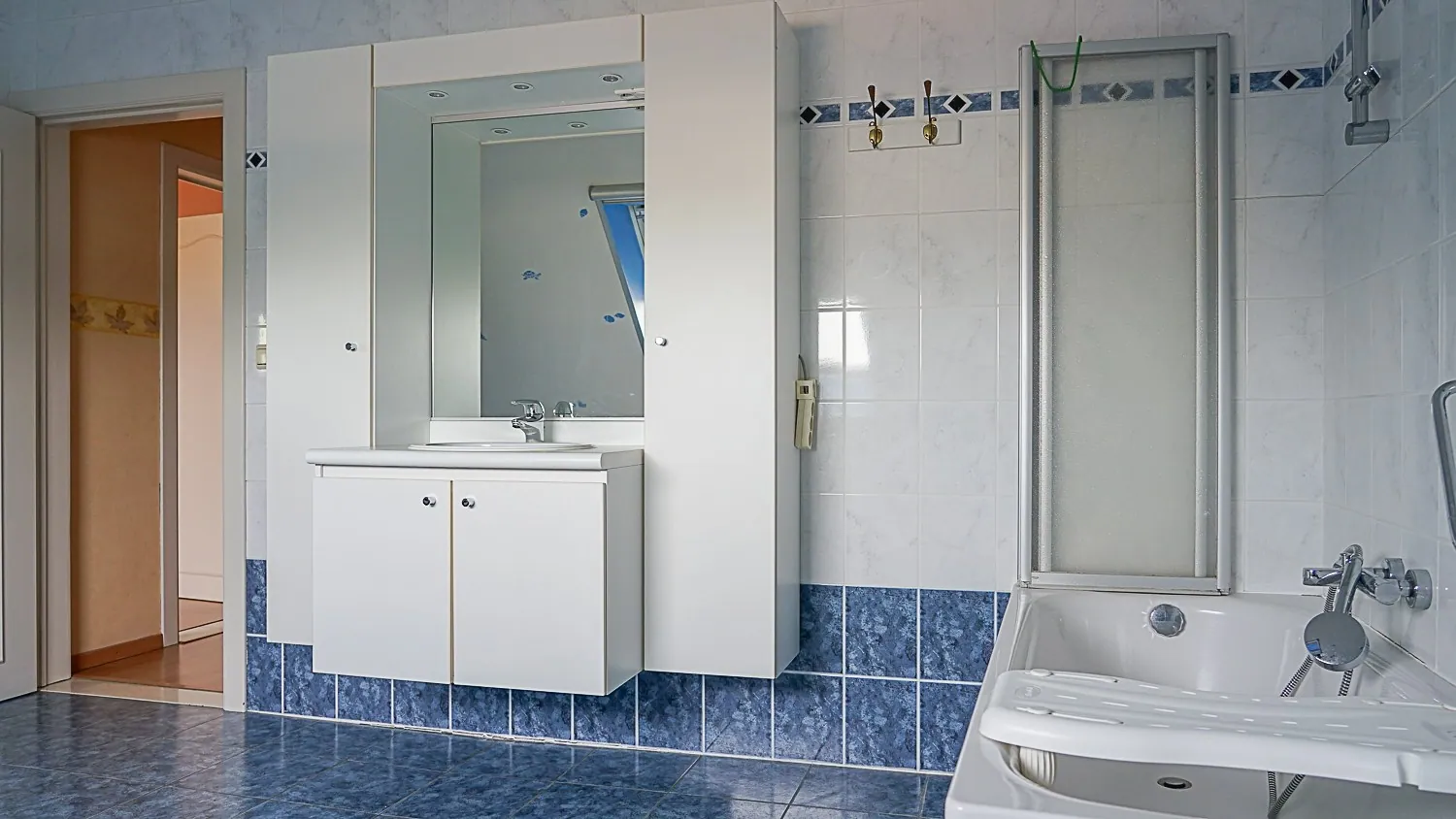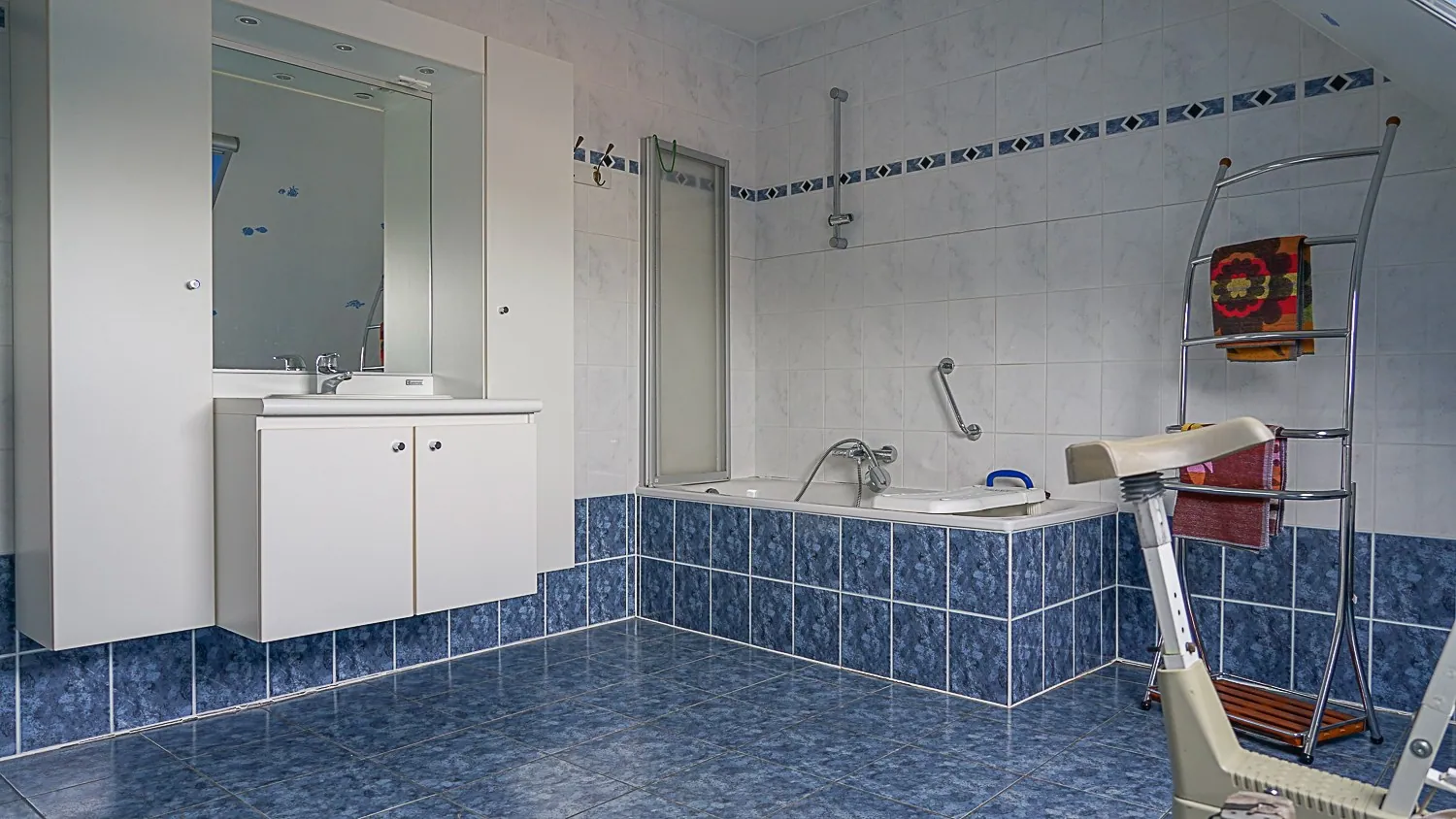 - Badkamer: (4,15 m x 3,00 m =12,45 m²) – tegels – ligbad met douchegarnituur – badkamermeubel met 1 wastafel – bergkast.