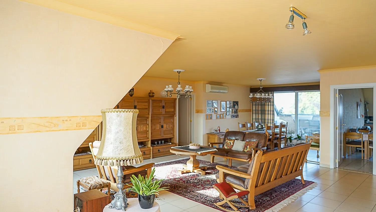 - Woonkamer: (7,30 m/4,15 m x 7,60 m/9,20 m = 60,00 m²) – tegels – zeer ruime, lichtrijke woonkamer met rechtstreeks toegang tot terras – airco.