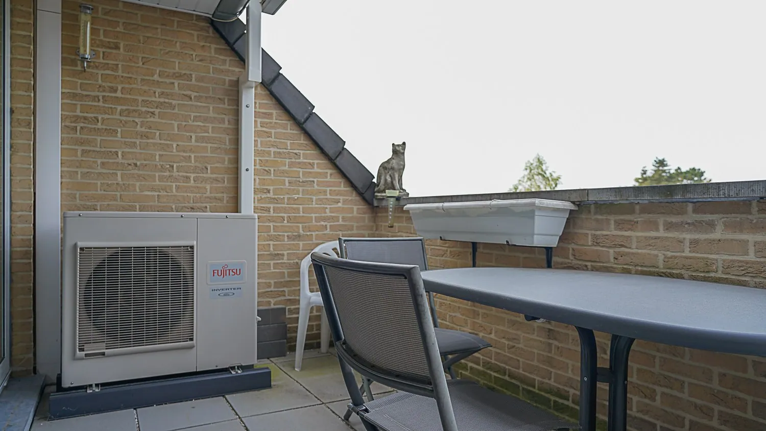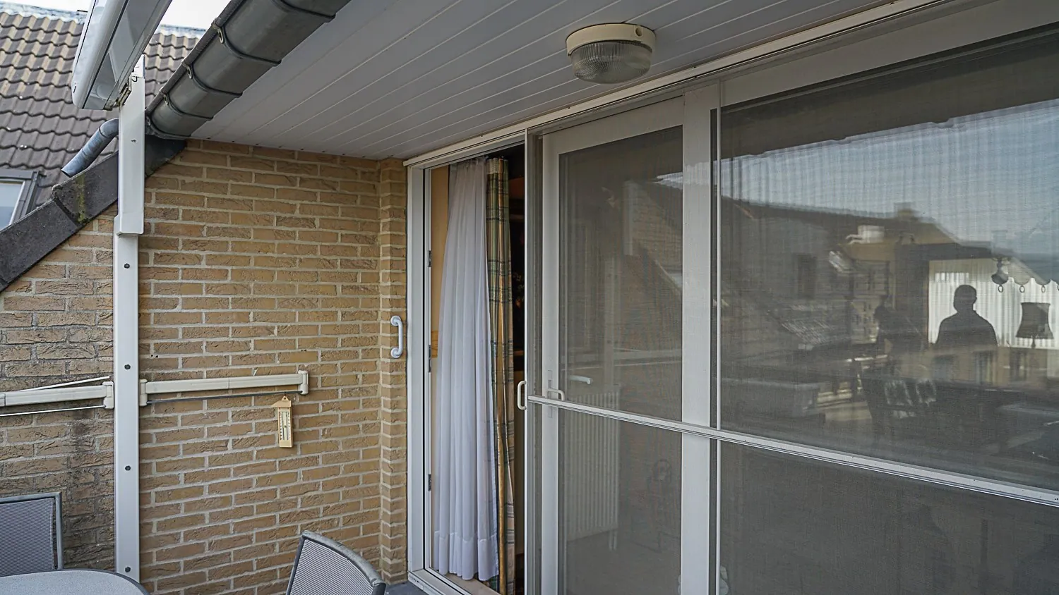 Terras: (4,15 m x 1,70 m = 7,06 m²) – terrastegels – toegang vanuit de woonkamer.