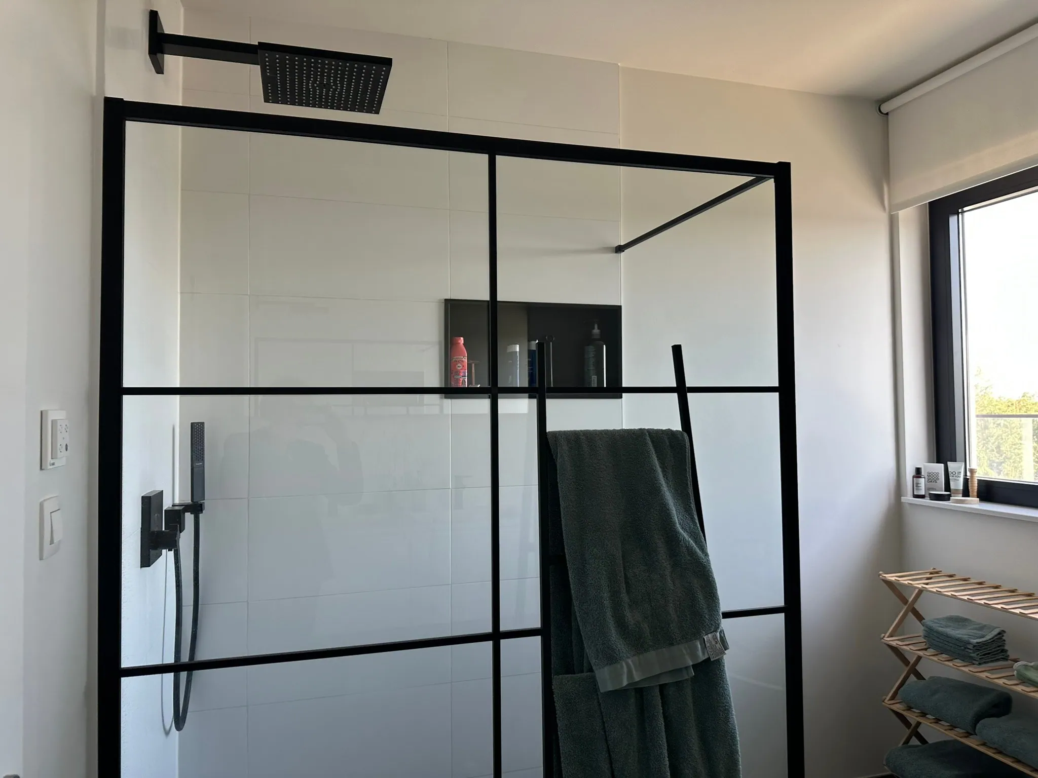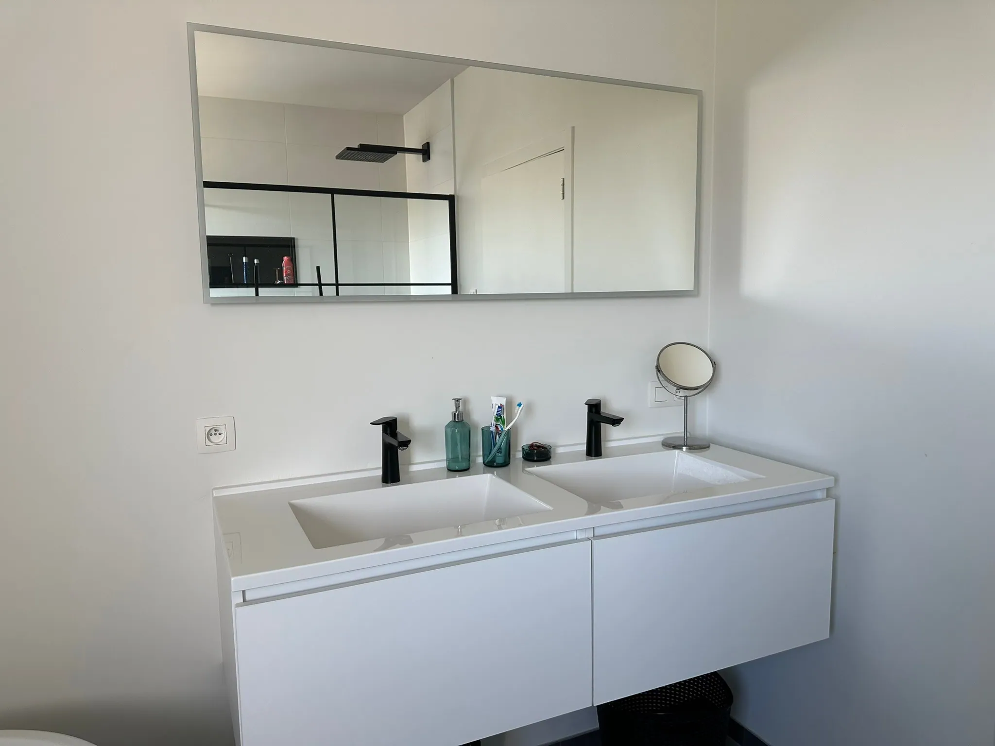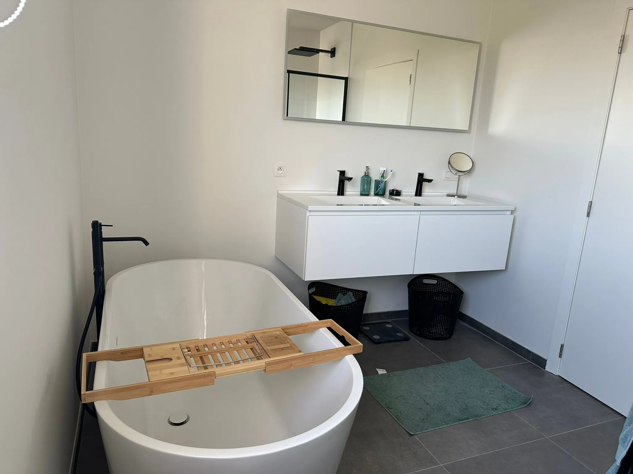 - Badkamer: (2,55 m x 3,14 m = 8 m²) – tegels – instapdouche – vrijstaand ligbad – badkamer meubel met 2 wastafels.