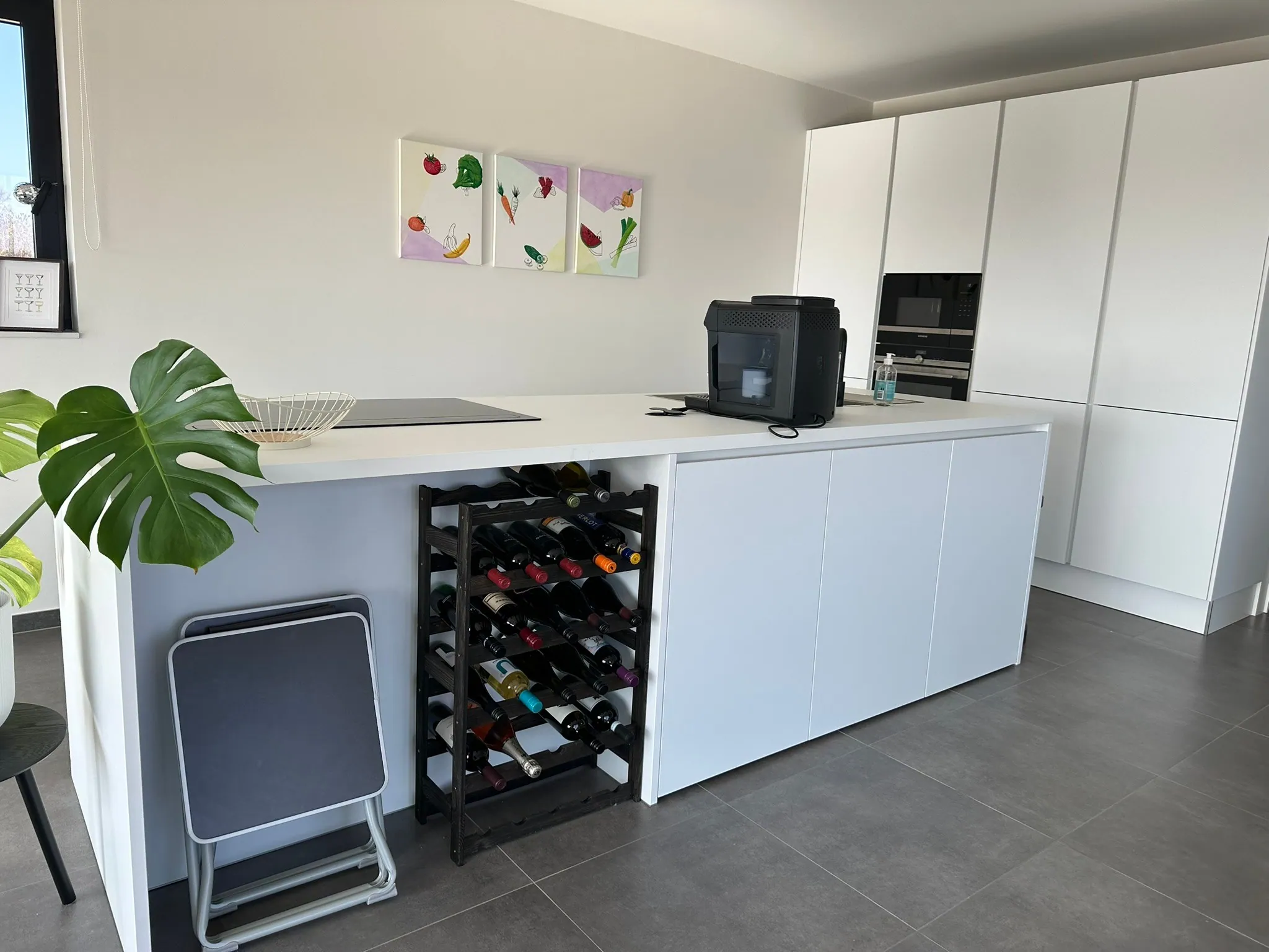 - Woonkamer met open keuken: (7,30 m x 8,50 m = 62 m²) – tegels – lichtrijke woonkamer met volledig ingerichte keuken met kookeiland – naast de vele opbergkasten en laden, is de keuken voorzien van oven, microgolf, vaatwas, koelkast, keramische kookplaat, dampkap.