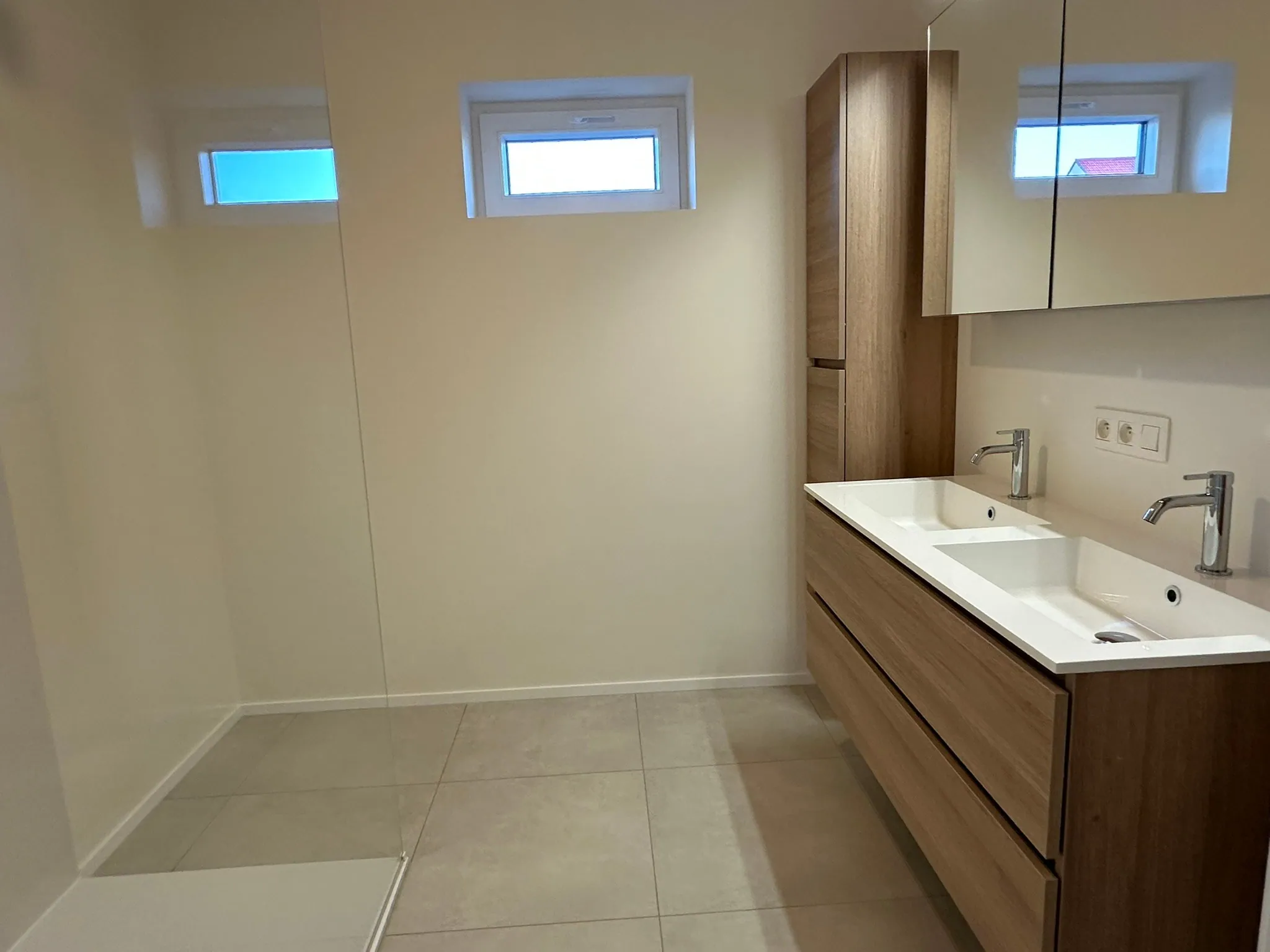 - Badkamer: (2,27 m x 2,37 m = 5 m²) – inloopdouche van 140 cm, met regendouche – badkamermeubel met 2 wastafels en laden, spiegelkastje en 2 kolomkasten.