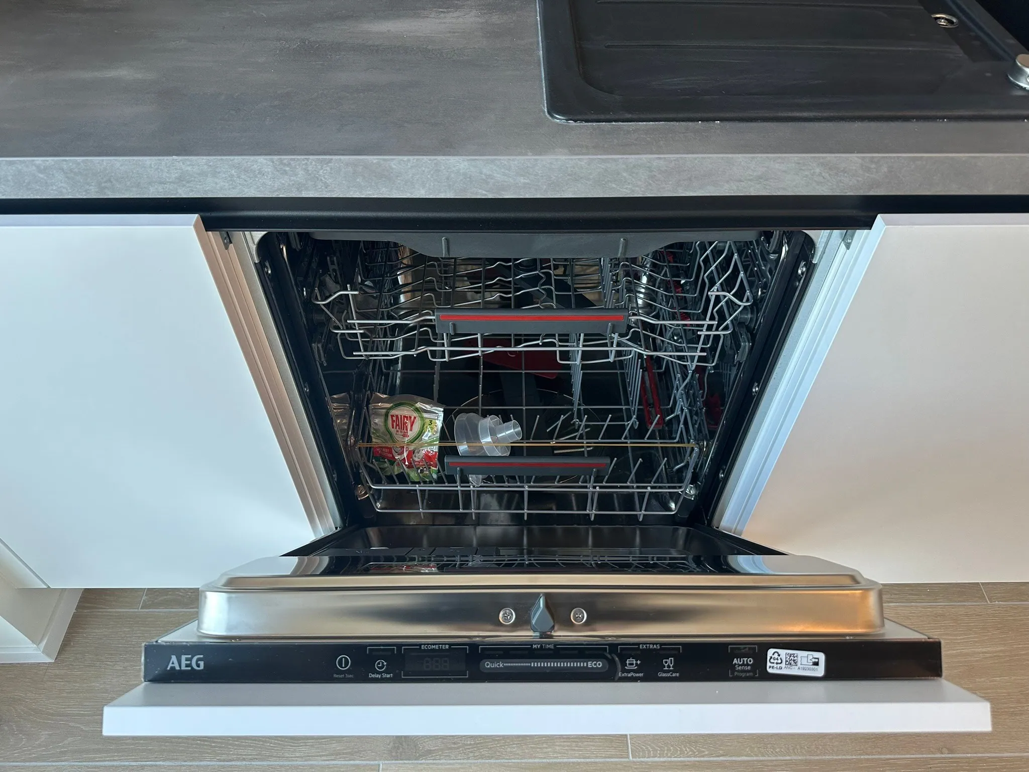 - Keuken: (2,37 m/3,97 m x 3,29 m = 11 m²) – tegels – open keuken - witte, volledig ingericht keuken met kookeiland met bartafel - diverse kasten, laden – AEG toestellen: vaatwas, koelkast, diepvries, oven, microgolf, inductiekookplaat met ingebouwde dampafzuiging.