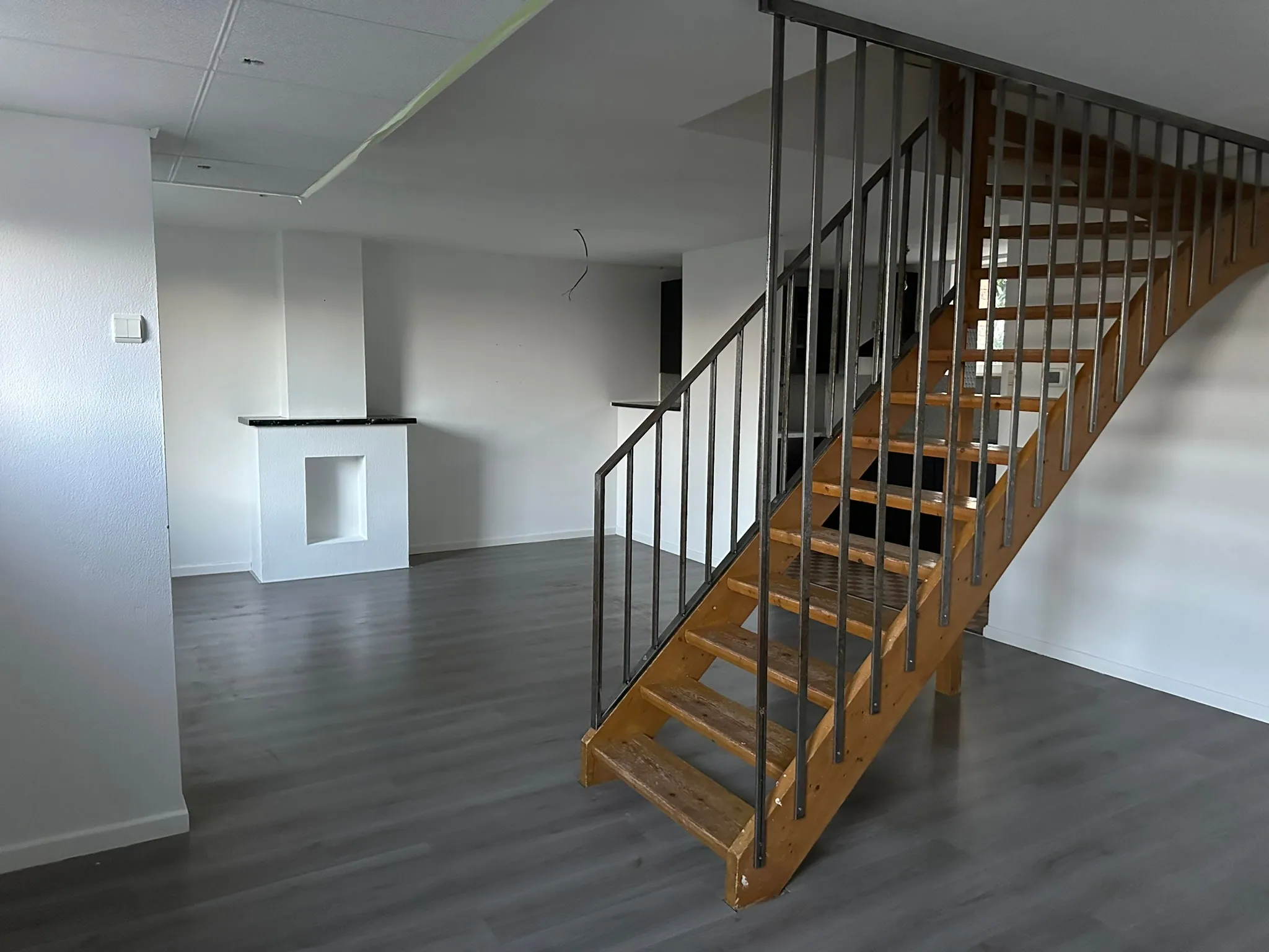 - Woonkamer: plankenvloer. Gezellige woonkamer. Zicht op het groen. Open trap naar de verdieping tussen eethoek en zithoek.