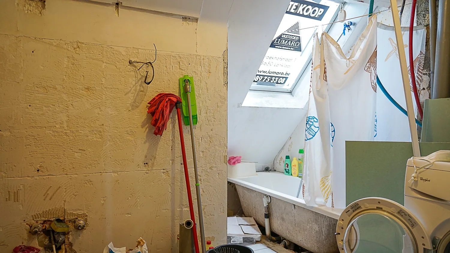 De badkamer is te renoveren; nieuw lavabomeubel is voorhanden maar wordt niet geplaatst.