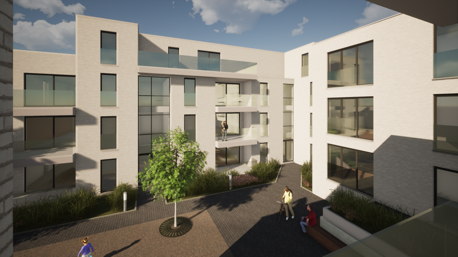 Het woonerf wordt gebouwd in 3 woonblokken, met in totaal 4 afzonderlijke ingangen en bijgevolg 4 afzonderlijke liften. De gebouwen situeren zich rond een centrale binnentuin van waaruit alle appartementen bereikbaar zijn.