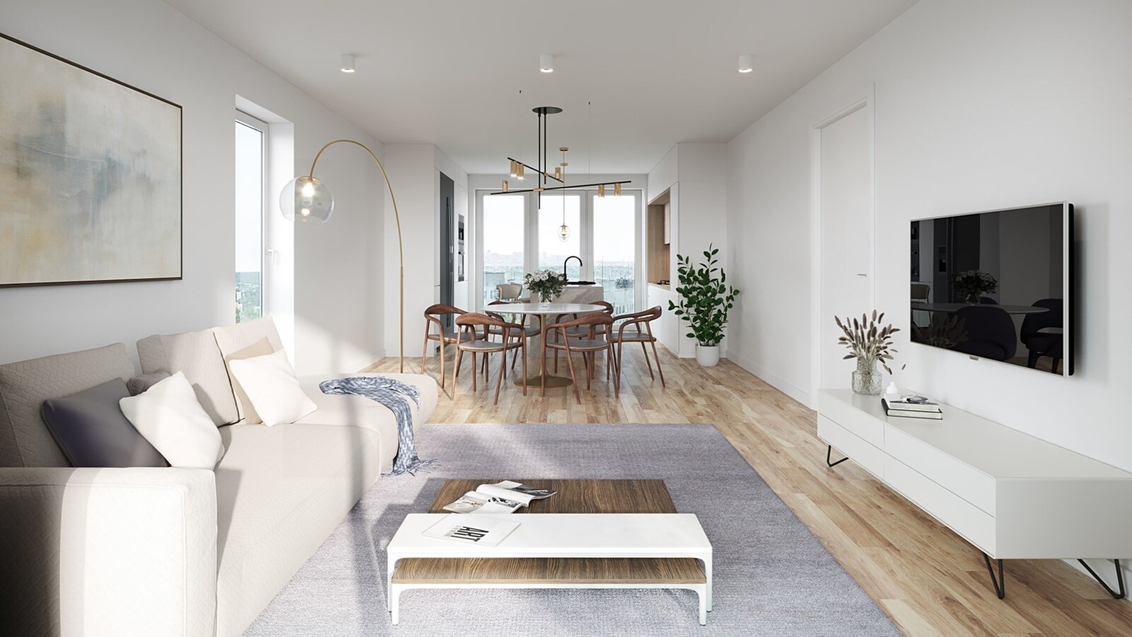 Indeling: woonkamer met open keuken (42 m²) – terras op het westen (11 m²) - 2 slaapkamers (14,85 m² en 9,42 m²) - badkamer (5 m²) - afzonderlijk toilet - berging (3,44 m²).
