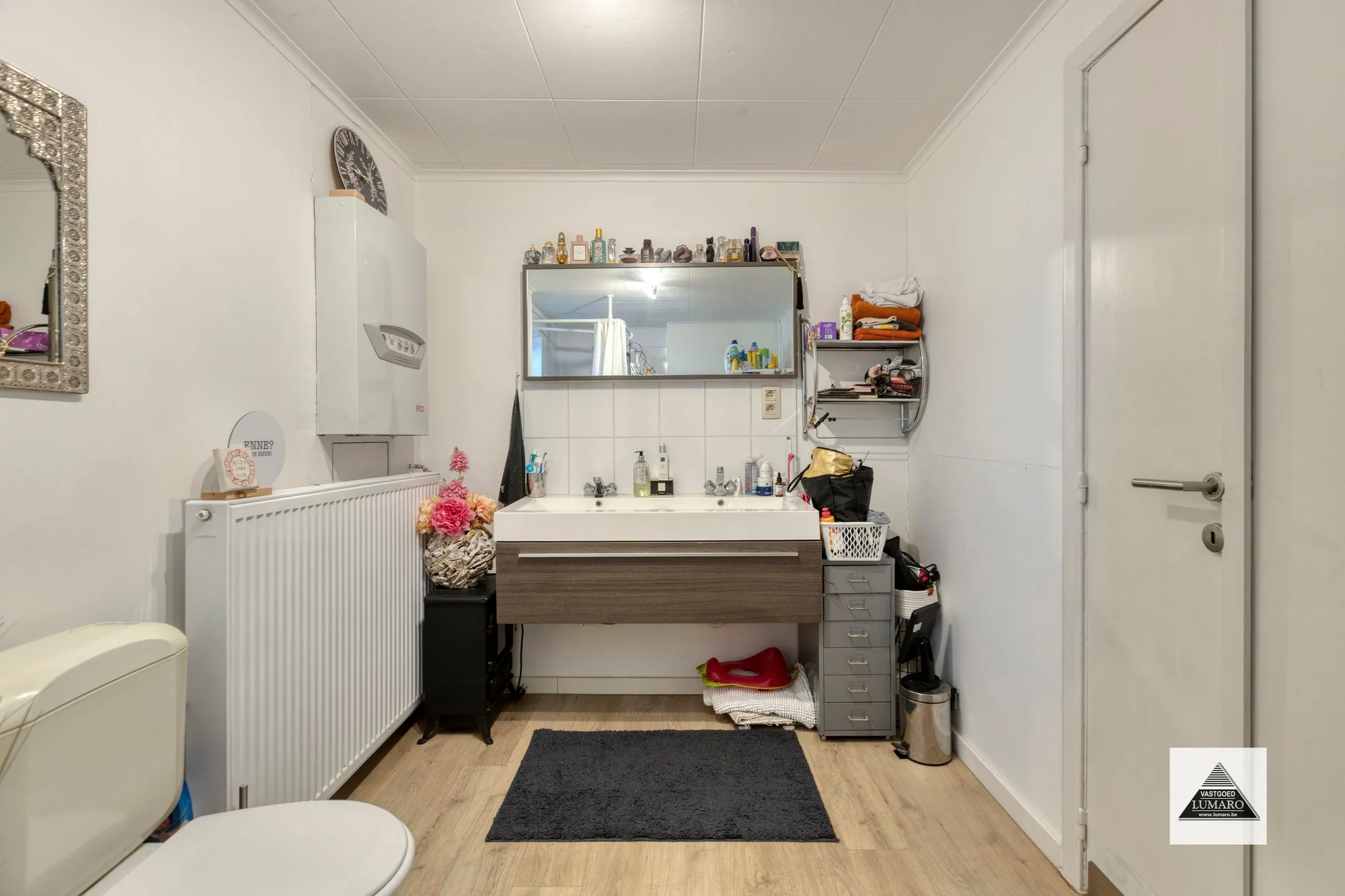 - Badkamer: (2,32 m x 3,92 m = 9,09 m²) – ingericht met douche met glazen wand – badkamermeubel met dubbele spoelbak en onderkast – toilet – aansluitingen voor wasmachine.