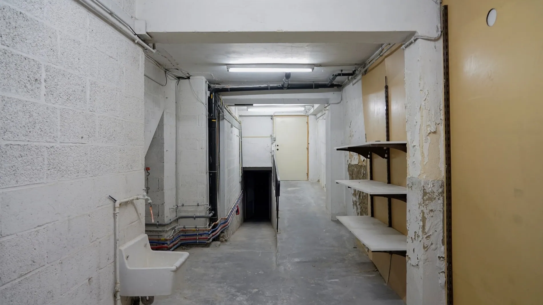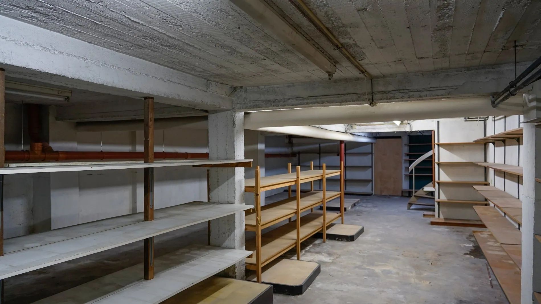 Langs de Pelserstraat is de kelder te bereiken via een hellend vlak. Van in de winkel zelf is er een wenteltrap naar de kelder.