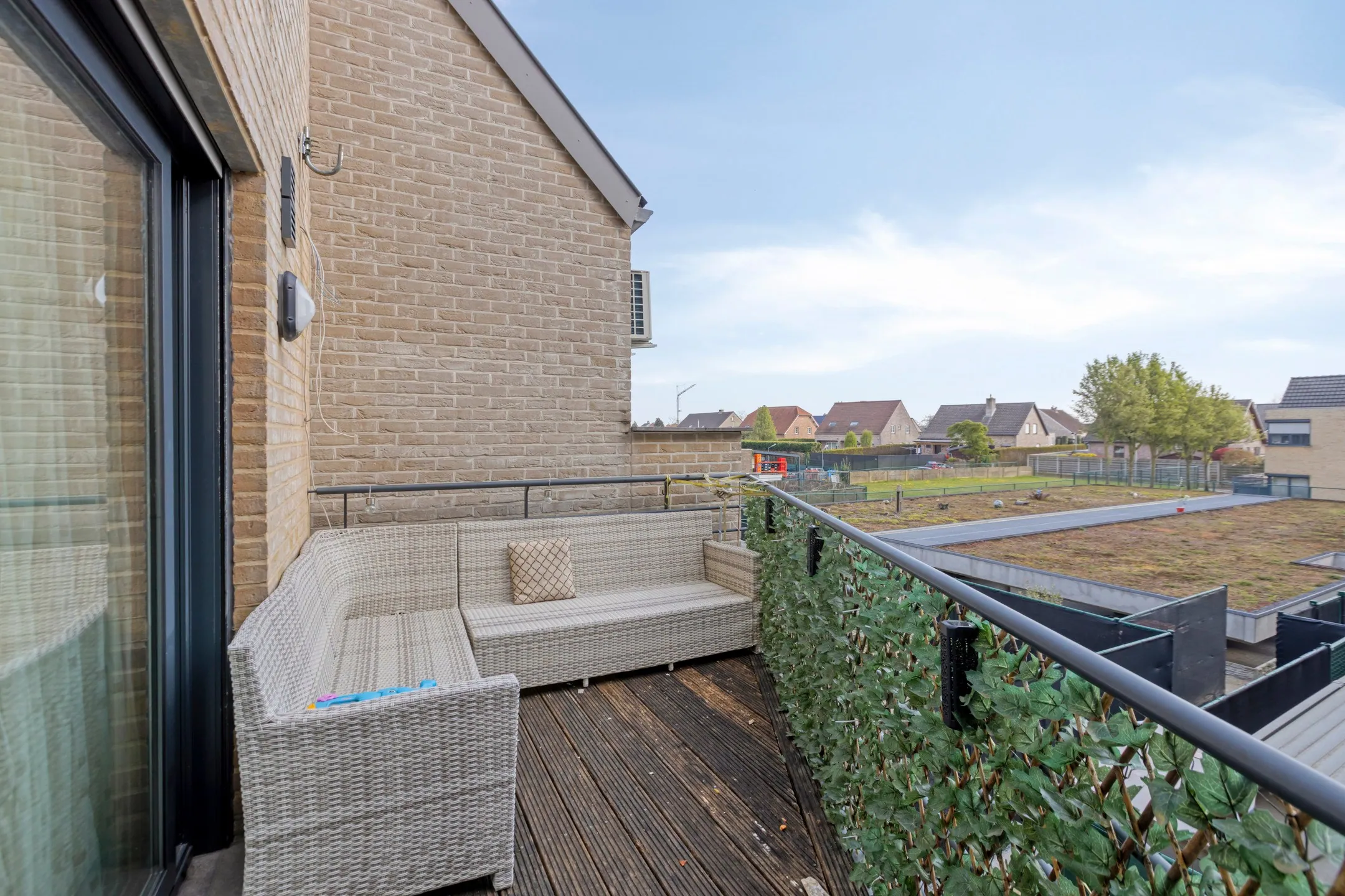 Aan de leefkamer met open keuken paalt een terras, toegankelijk via een groot schuifraam. Op de 2de verdieping bevinden zich 2 ruime slaapkamers en badkamer (met 2de toilet).