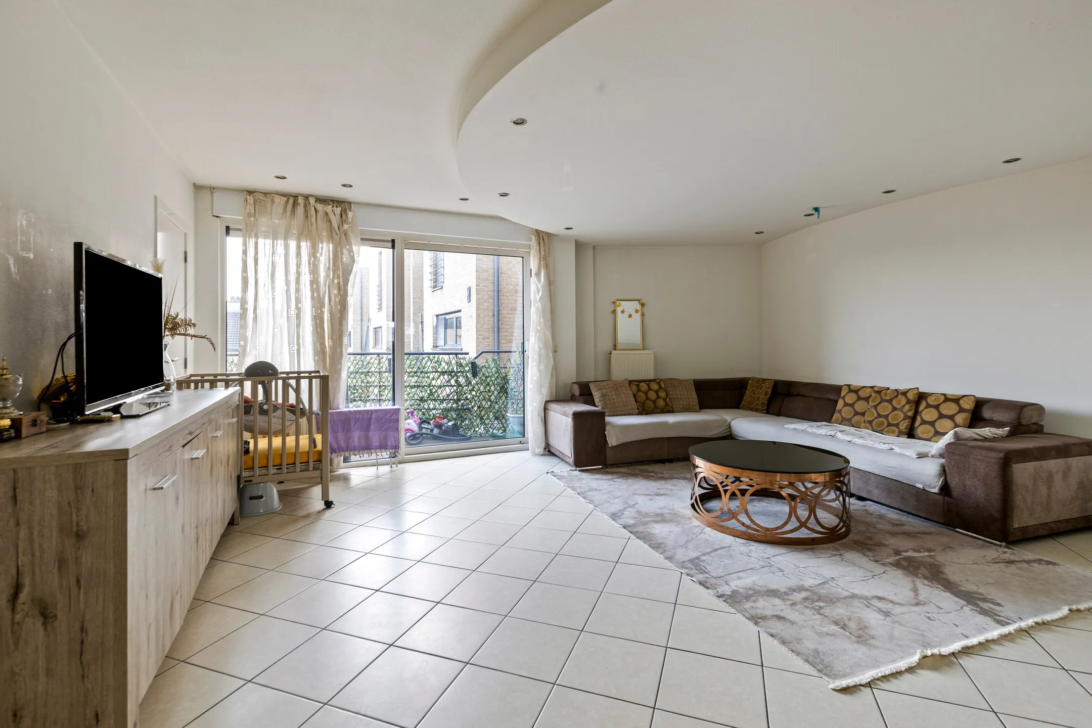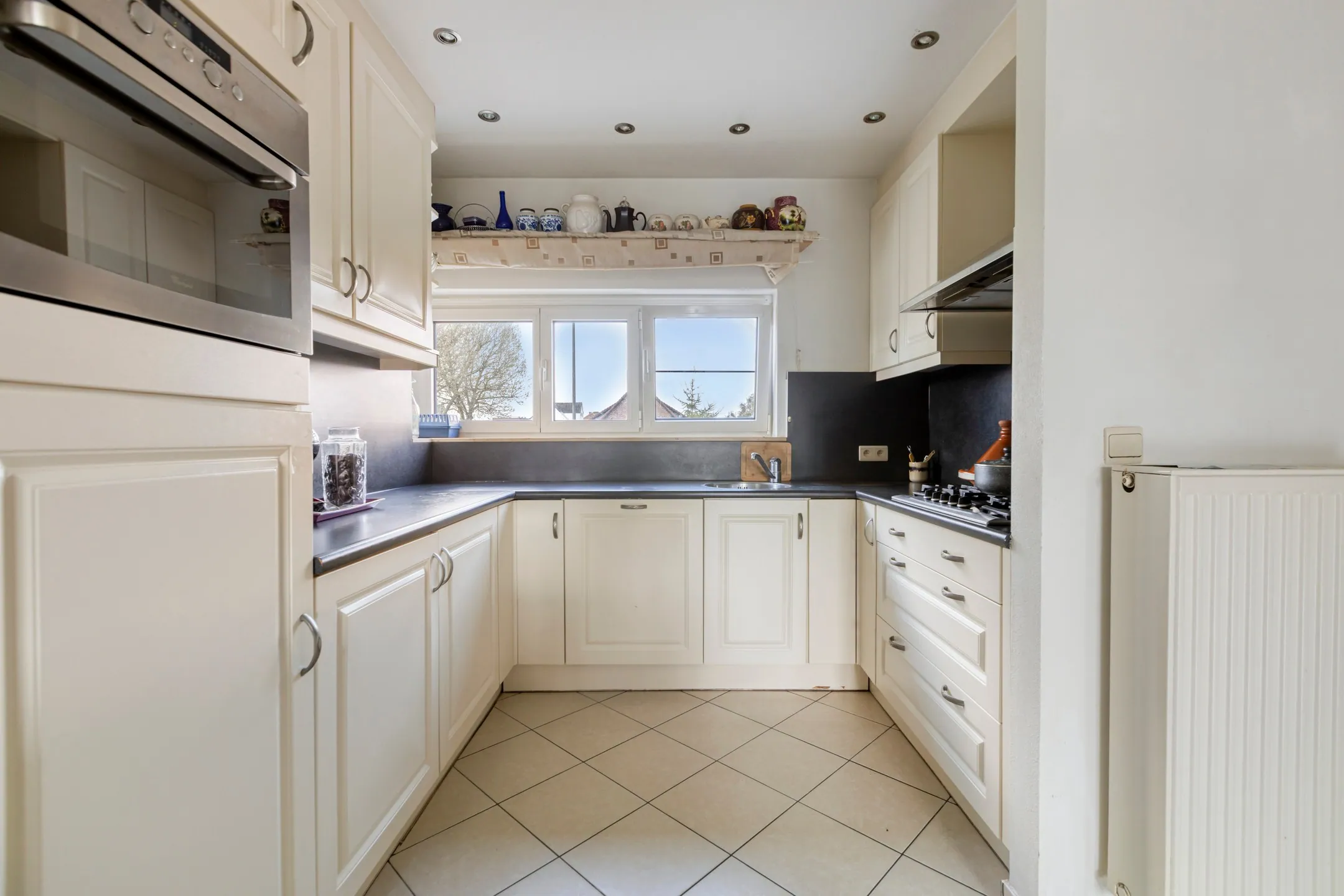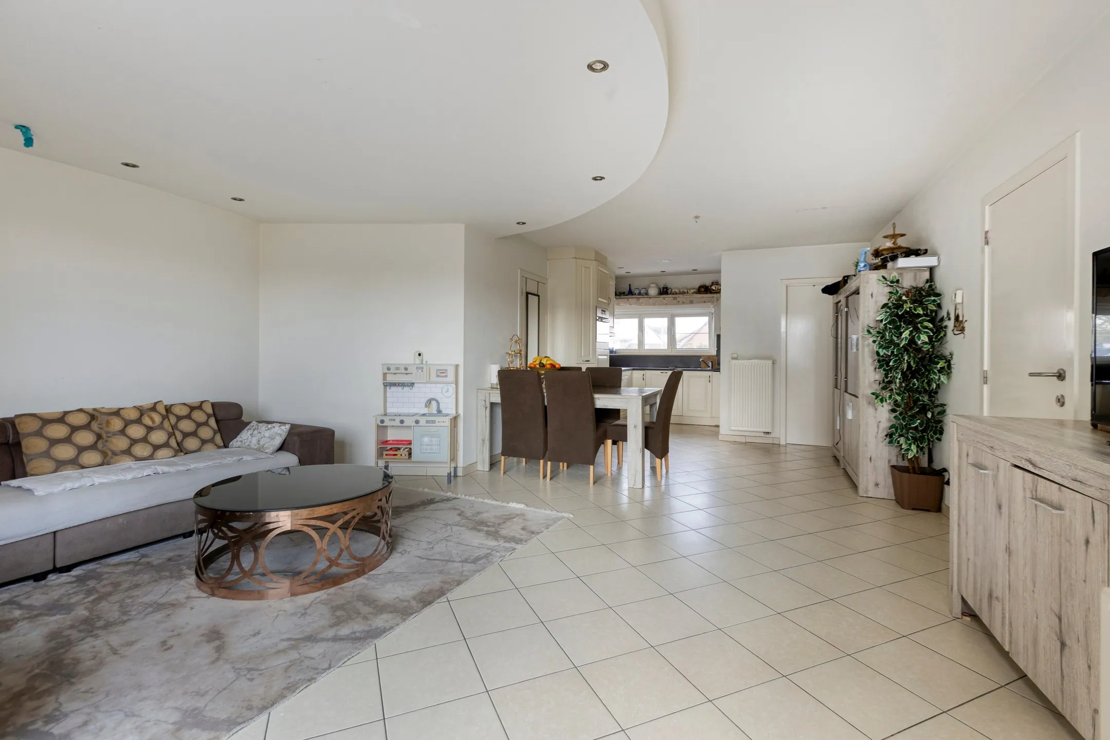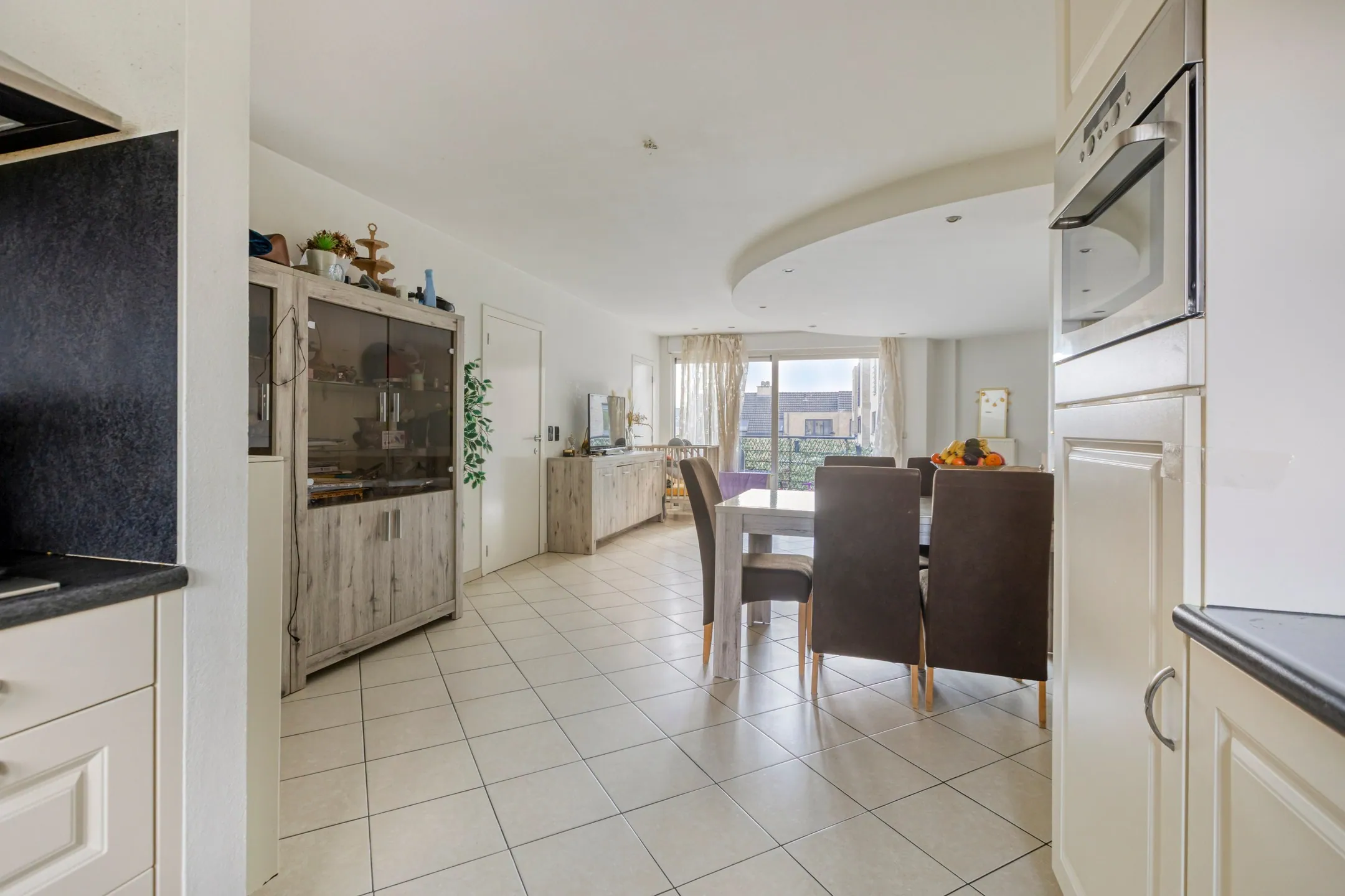 - Woonkamer met open keuken: 42 m² - tegelvloer - parlofoon - 2 aansluitingen voor ... TV - aansluiting voor telefoon – volledig ingerichte open keuken in U-vorm - HPL (duropal) werkblad - koelkast – RVS (roestvrijstaal) dampkap – 5-pits gasfornuis - afwasmachine – combi-magnetron – plafond met inbouwspots – ramen naar de straatkant.
