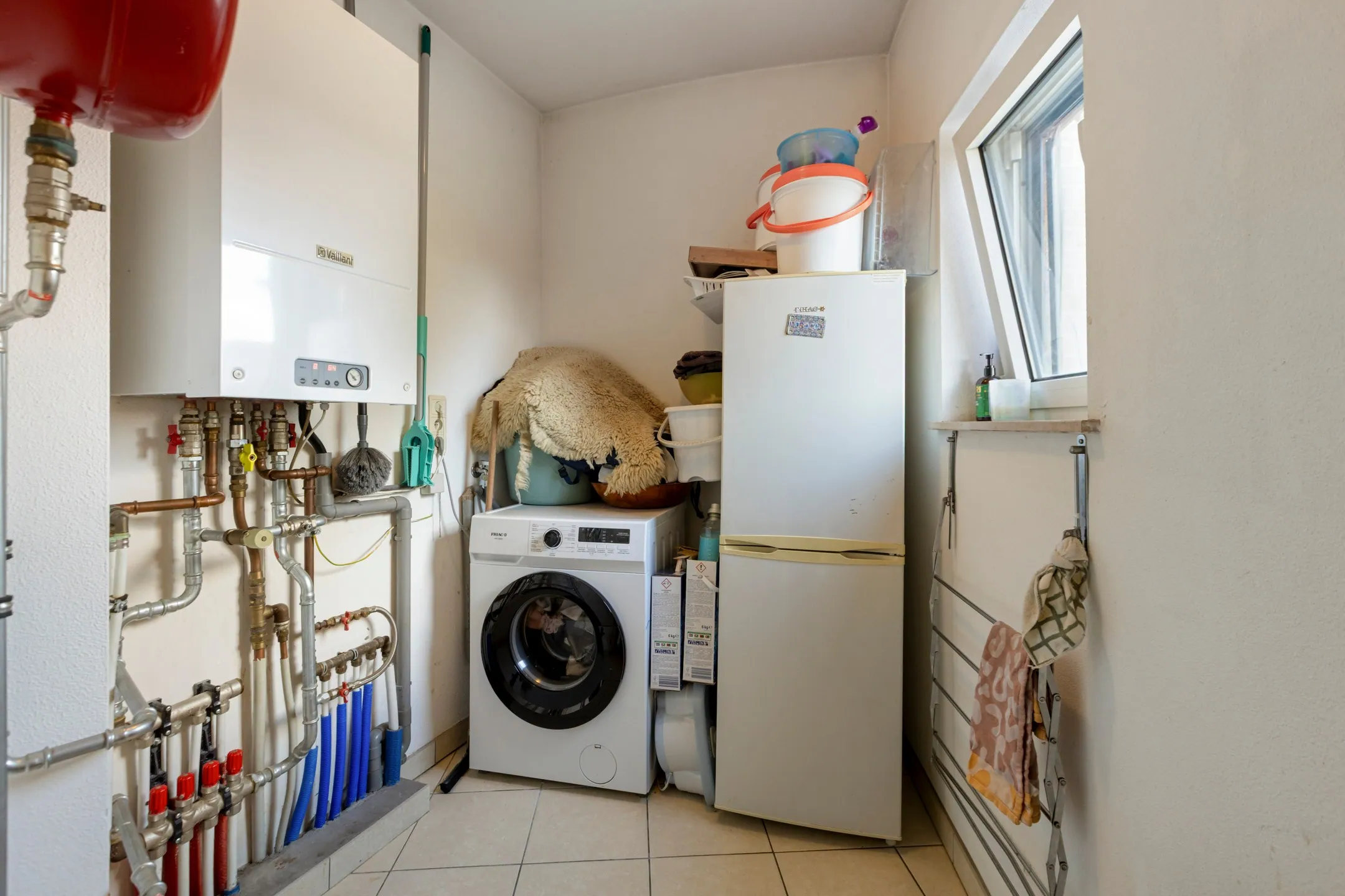 - Berging 1: 3,44 m² - gelegen vlakbij de keuken - tegelvloer aansluitingen voor wasmachine - hier bevindt zich de gaswandketel Vaillant - venster naar de straat.