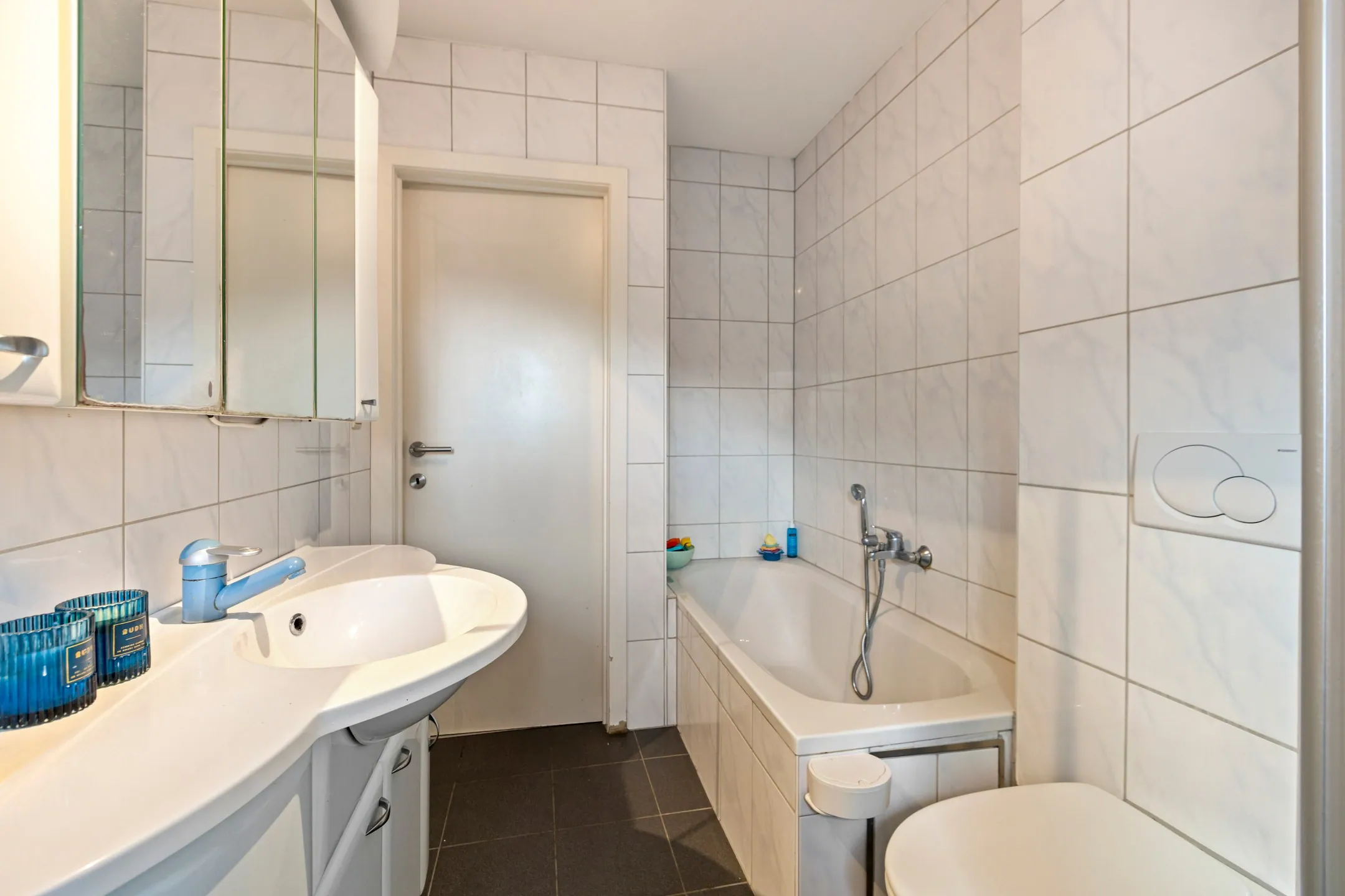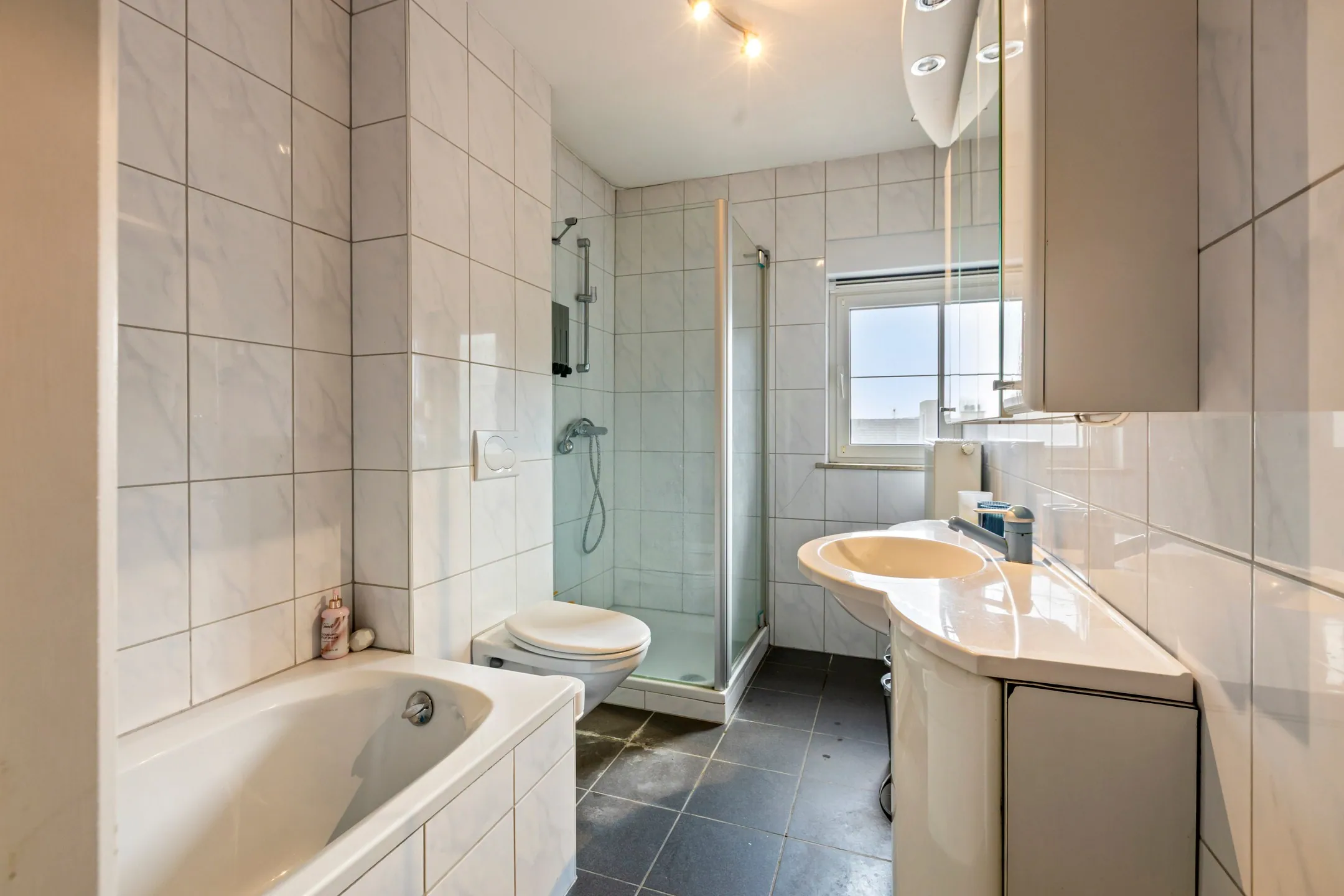 - Badkamer: (1,85 m x 3,50 m / 2,90 m = 5,85 m²) – tegelvloer - ingericht met douche, badmeubel met spots, ligbad, 2de toilet – buitenraam – muurbetegeling.