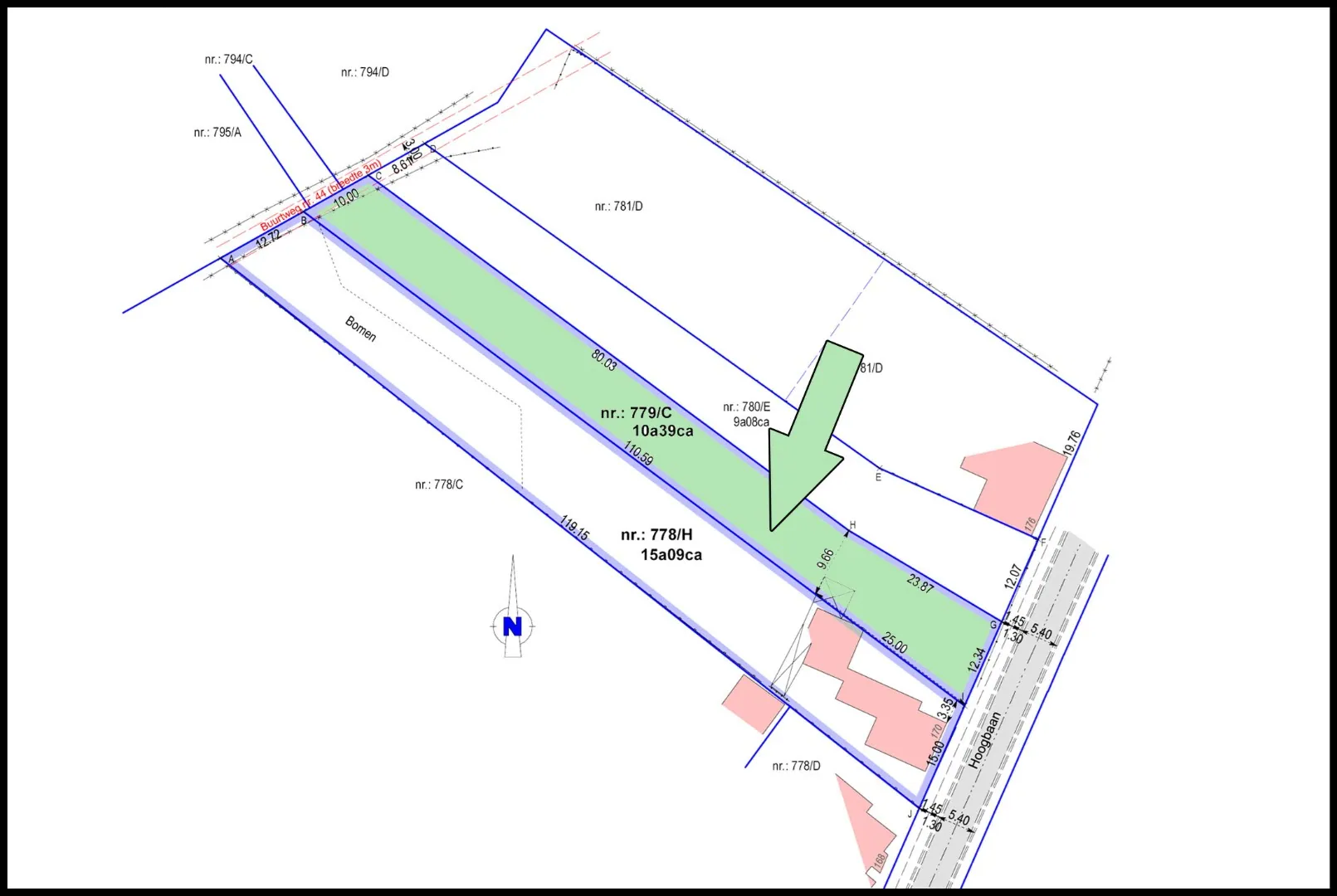 De perceelsgrens staat niet haaks op de Hoogbaan. Contacteer ons voor meer informatie omtrent de voorbouwlijn.