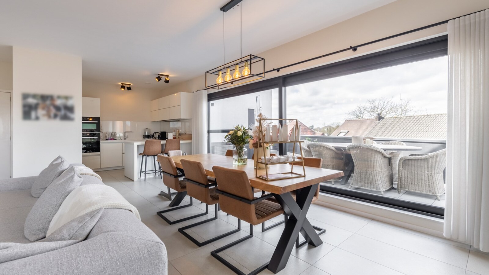 Aan de hoek van de Nieuwstraat met de Rijksweg, op de tweede verdieping, ligt dit schitterende penthouse van 160 m² groot! Vanuit de leefruimte zijn 2 schuiframen naar het terras van 45 m². De keuken is half-open en in U-vorm opgesteld met een eetbarretje. Het appartement telt 3 slaapkamers. In de nachthal is een grote ingebouwde kastenwand van 5,25 m lang, tot plafondhoogte. Hoog wooncomfort dankzij de vloerverwarming in de leefruimtes en airco in woonkamer en masterbedroom. In de kelderverdieping is een private autostandplaats.