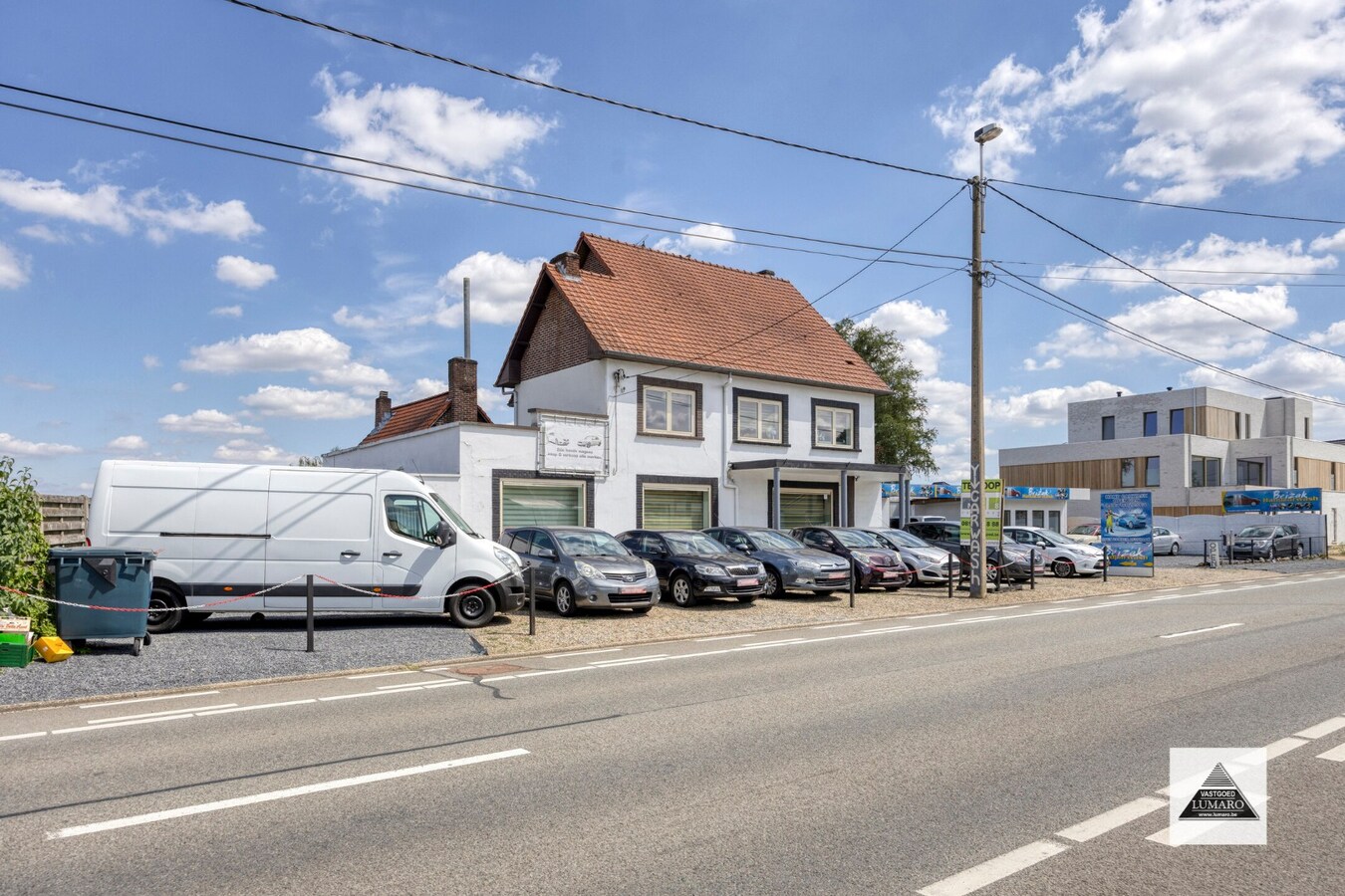 Garage. Er zijn 3 keukens ingericht. 2 zijn gelijkvloers, de 3de ligt op de 2de verdieping.