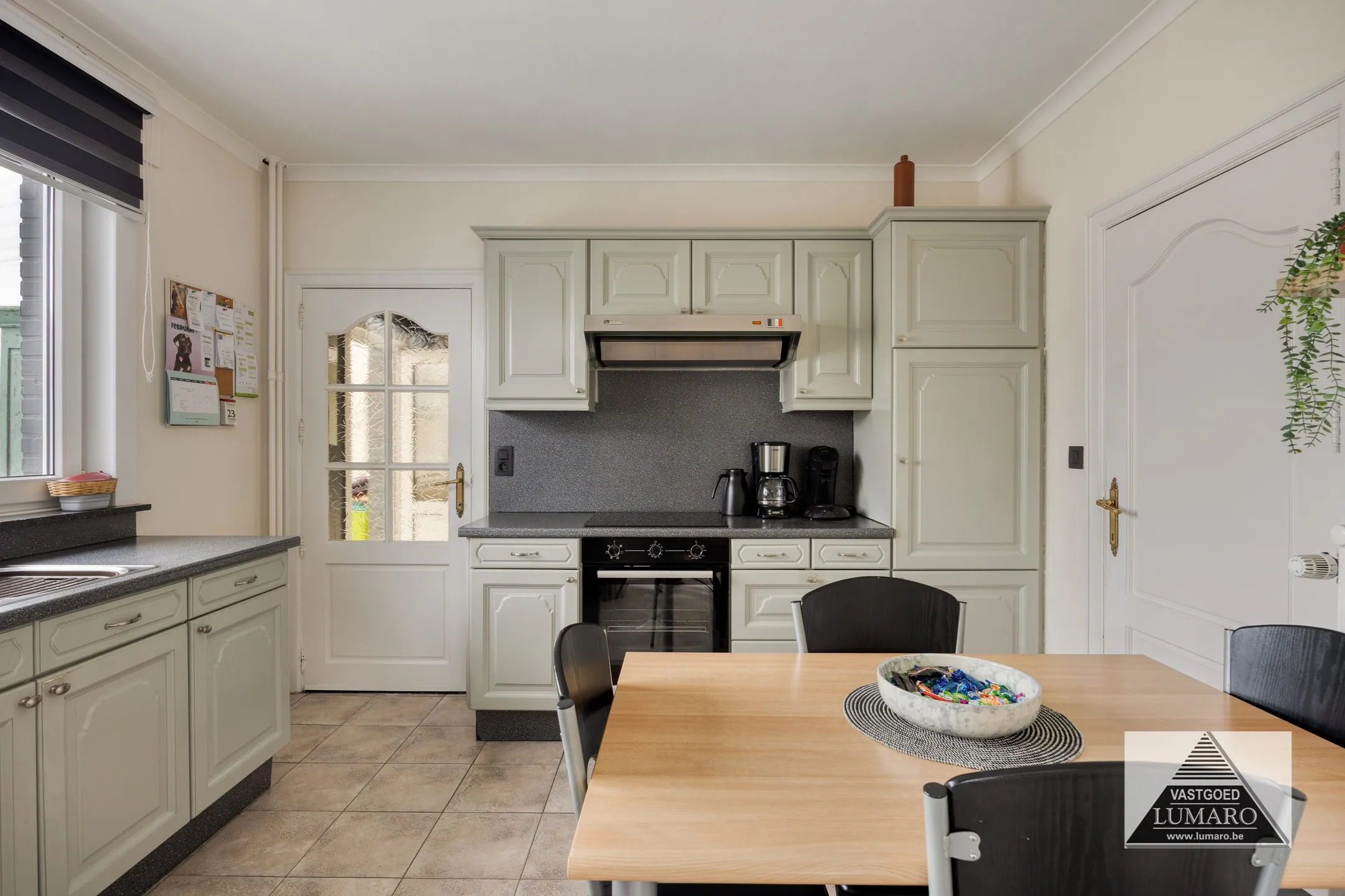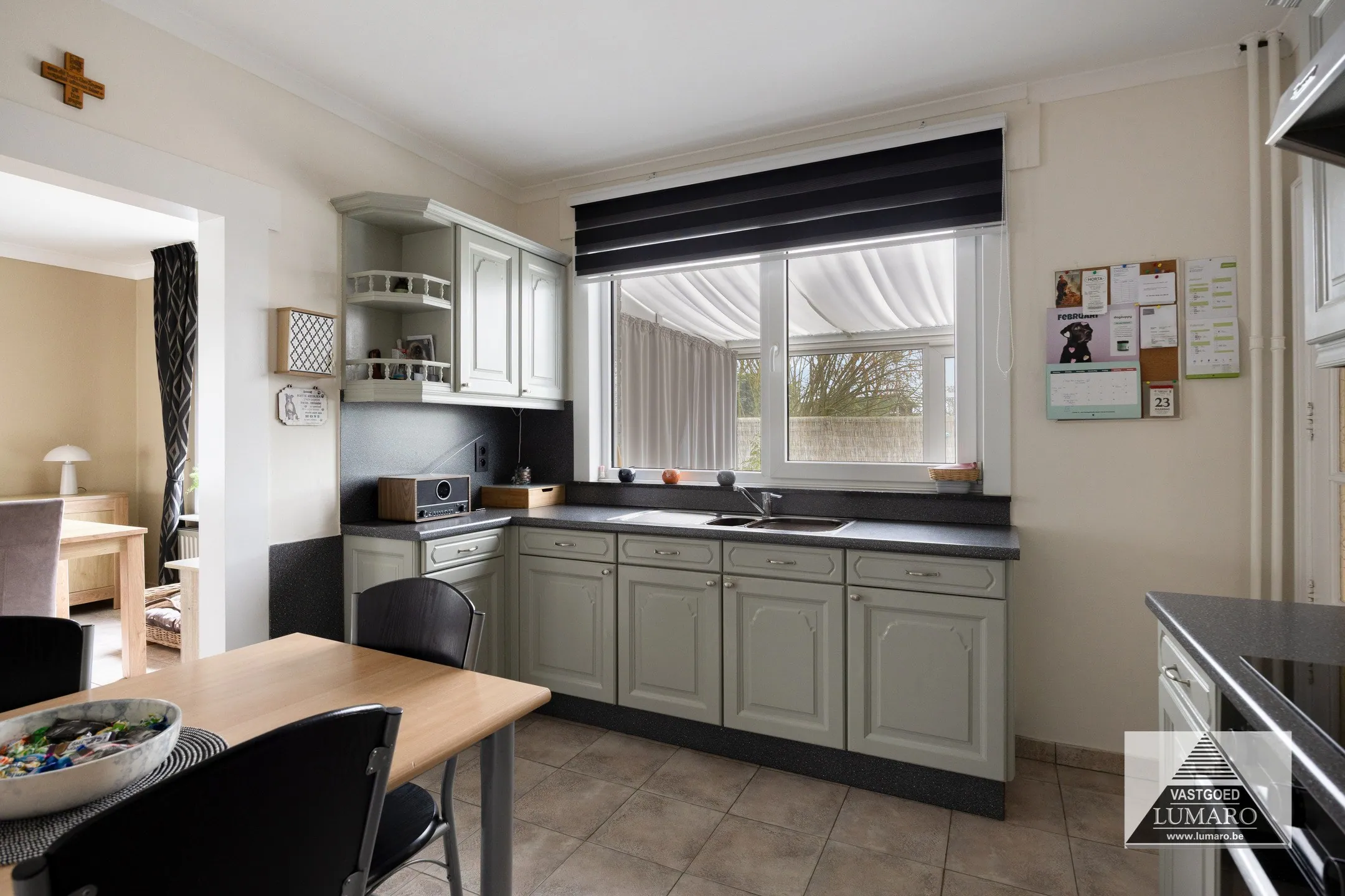 - Keuken : (3,30 m x 3,51 m = 11,58 m²) – tegelvloer – leefkeuken met breed raam op de achtergevel – ingericht met keramische kookplaat – dampkap – oven – 1,5 spoelbak met afdruiprek.