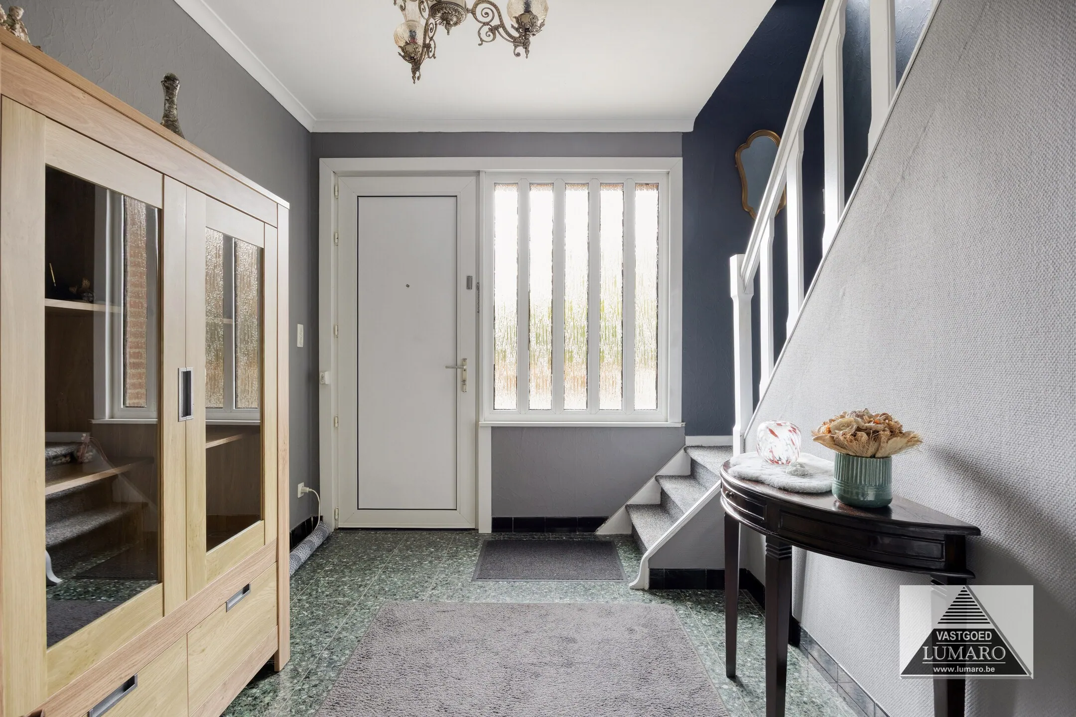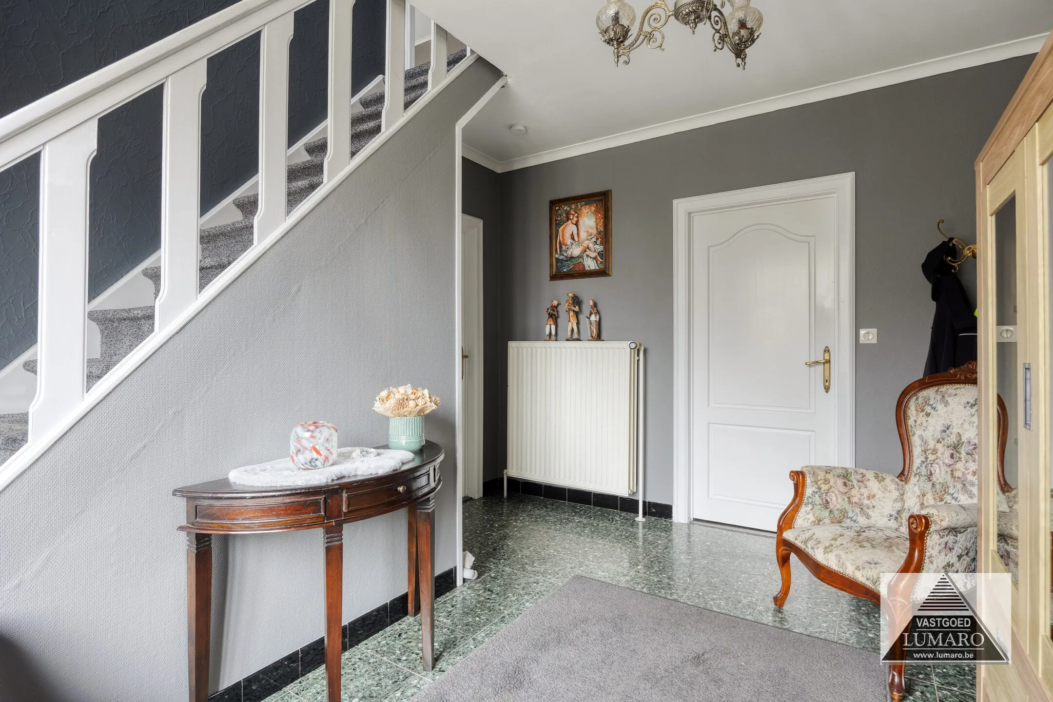 - Inkom: (3,30 m x 4,00 m = 13,20 m²) – tegelvloer – royale ... inkomhal met trap naar de verdieping – van hieruit is toegang naar woonkamer en keuken.