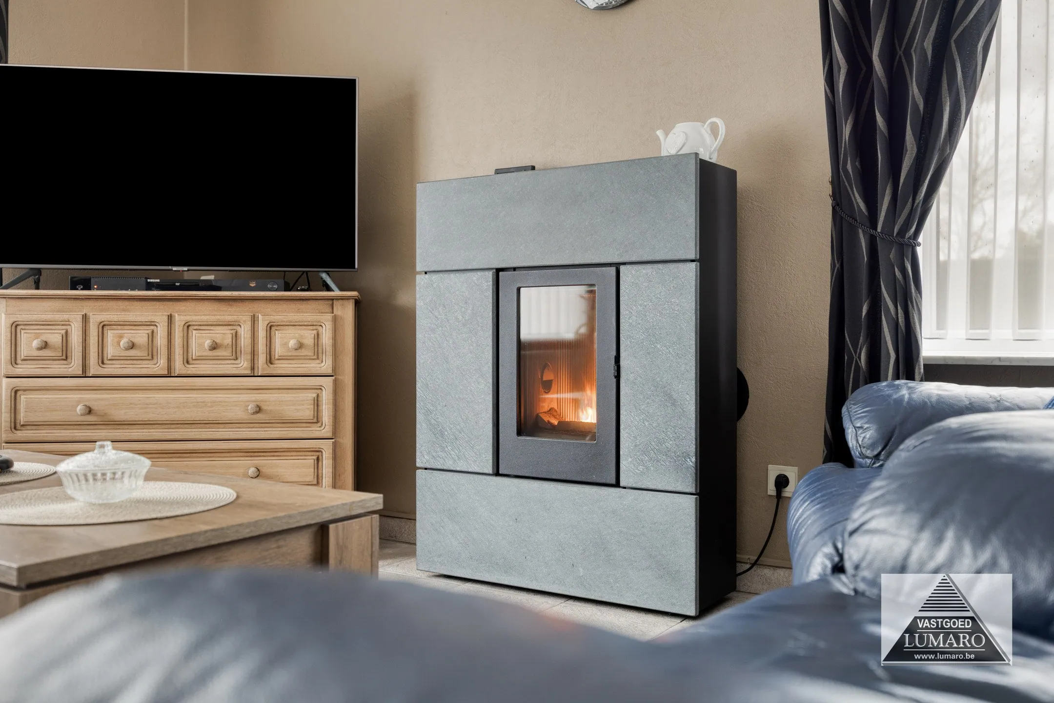 - Woonkamer: (3,75 m x 7,60 m = 28,50 m²) – leefkamer met groot raam naar straatzijde en naar de zijtuin – de centrale verwarming werkt op stookolie – in de woonkamer is bijkomend een sfeervolle pelletkachel geplaatst met speksteen (leverancier Openhaarden Smeulders uit Elen).