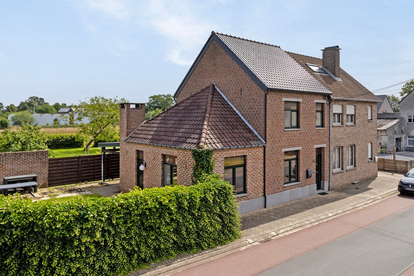 - Achter de woning is een overdekt beklinkerd terras – aanpalend gazon – looppad richting garage.