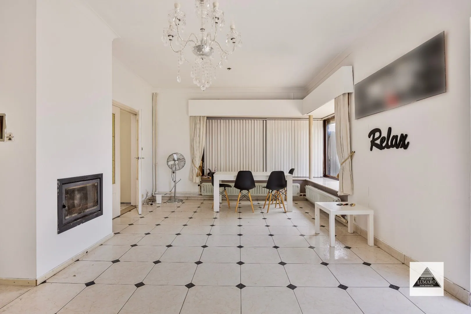 - Woonkamer: (4,15 m x 7,70 m = 32 m²) - tegelvloer - Flam haardcassette ... (hout) - toegang naar aanpalend terras via dubbele glasdeur (met rolluik).