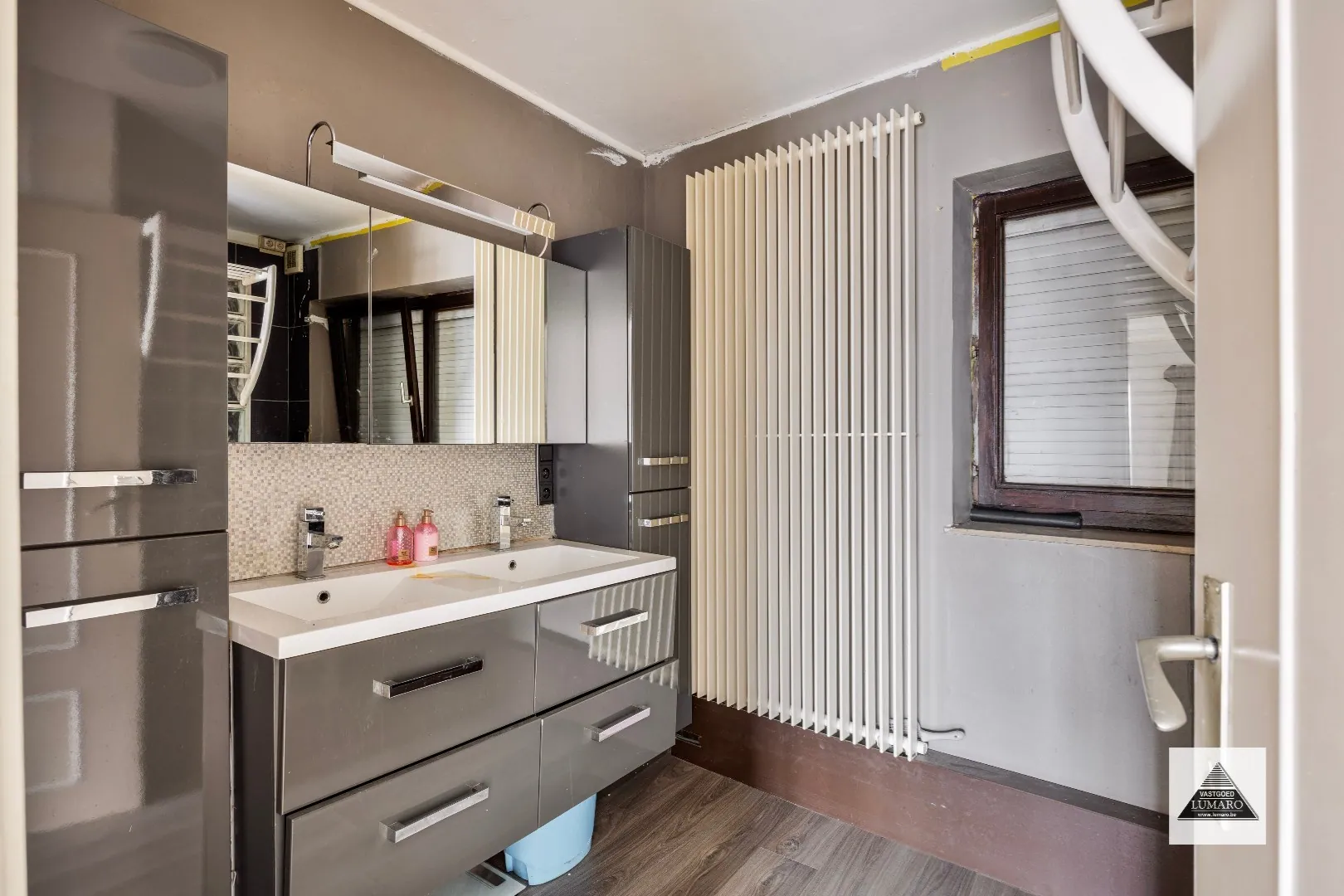 - Badkamer: (2,88 m x 2,15 m = 6,20 m²) – tegelvloer - sierradiator – venster – badkamermeubel met dubbele wastafel – douche.