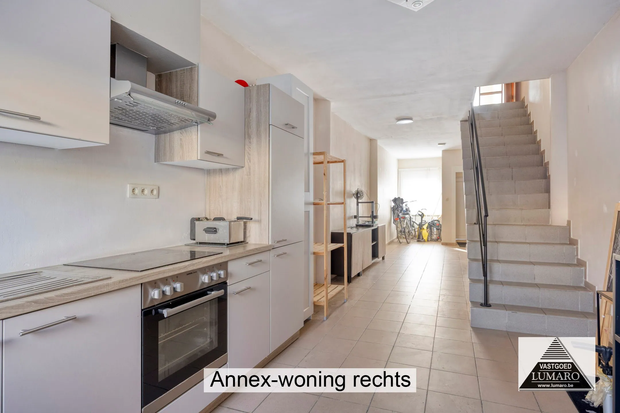 - Woonkamer met open keuken: (3m x 12,50m = 37,50 m²) - tegelvloer - inkomhal – betegelde trap naar de verdieping – open keuken met deur naar het terras – keuken ingericht met fornuis - dampkap - oven - koelkast.