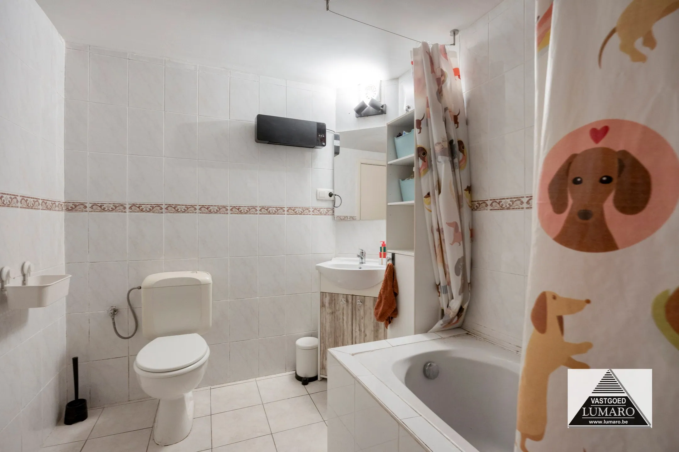 - Badkamer: (2,10m x 3m = 6,30 m²) - tegelvloer en muurbetegeling - ligbad - badkamermeubel - toilet.