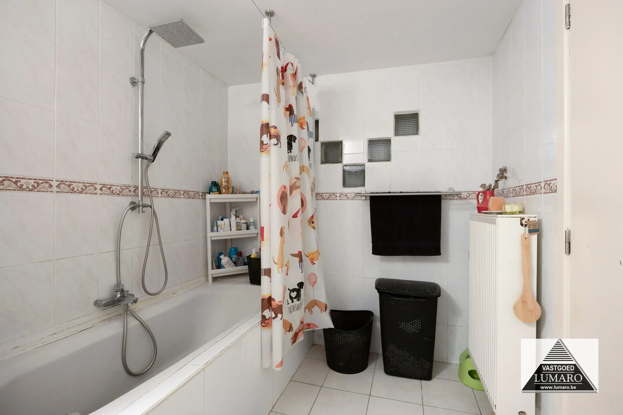 - Badkamer: (1,06m x 3,17m = 3,39 m²) - tegelvloer en muurbetegeling - douche - wastafel - toilet.