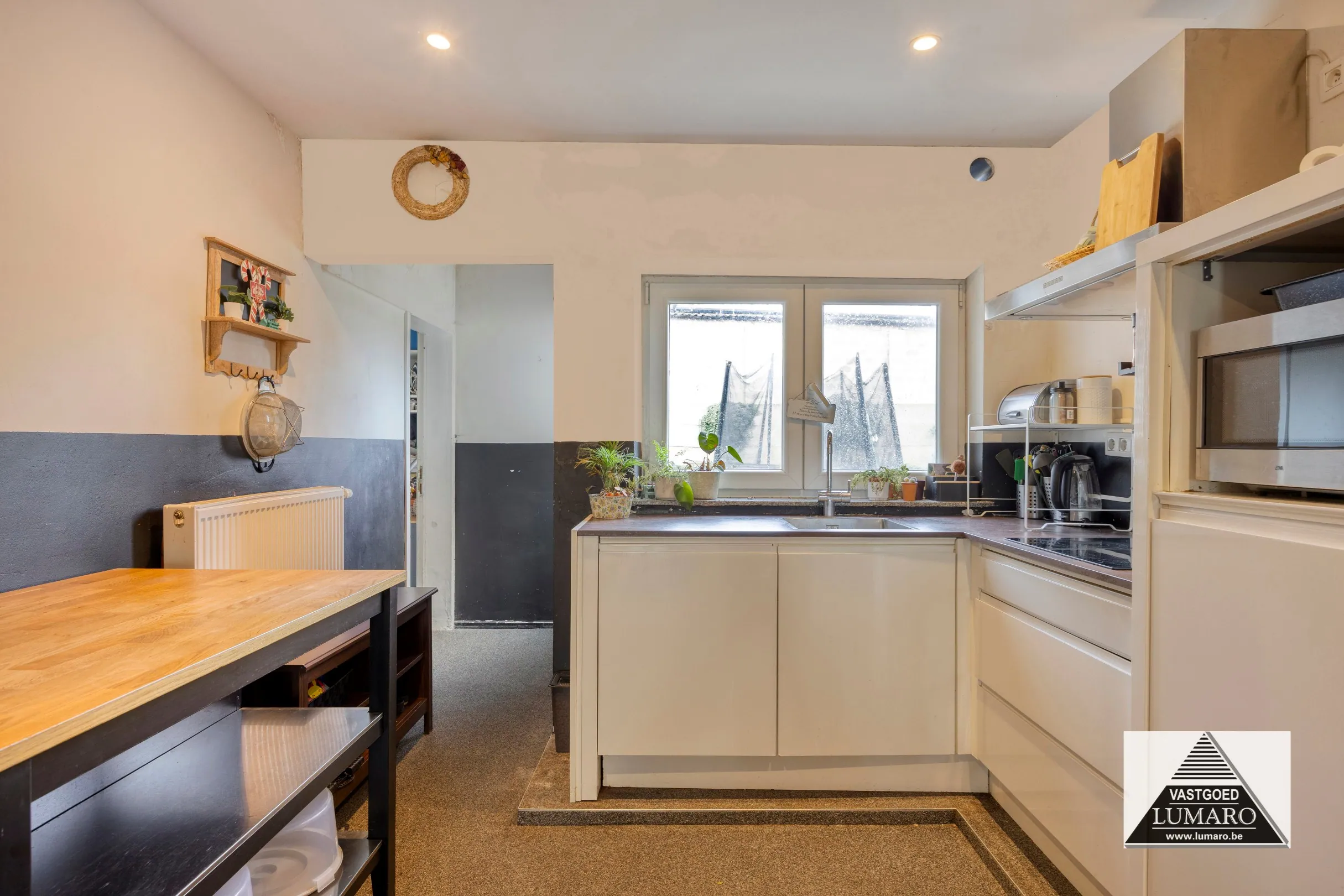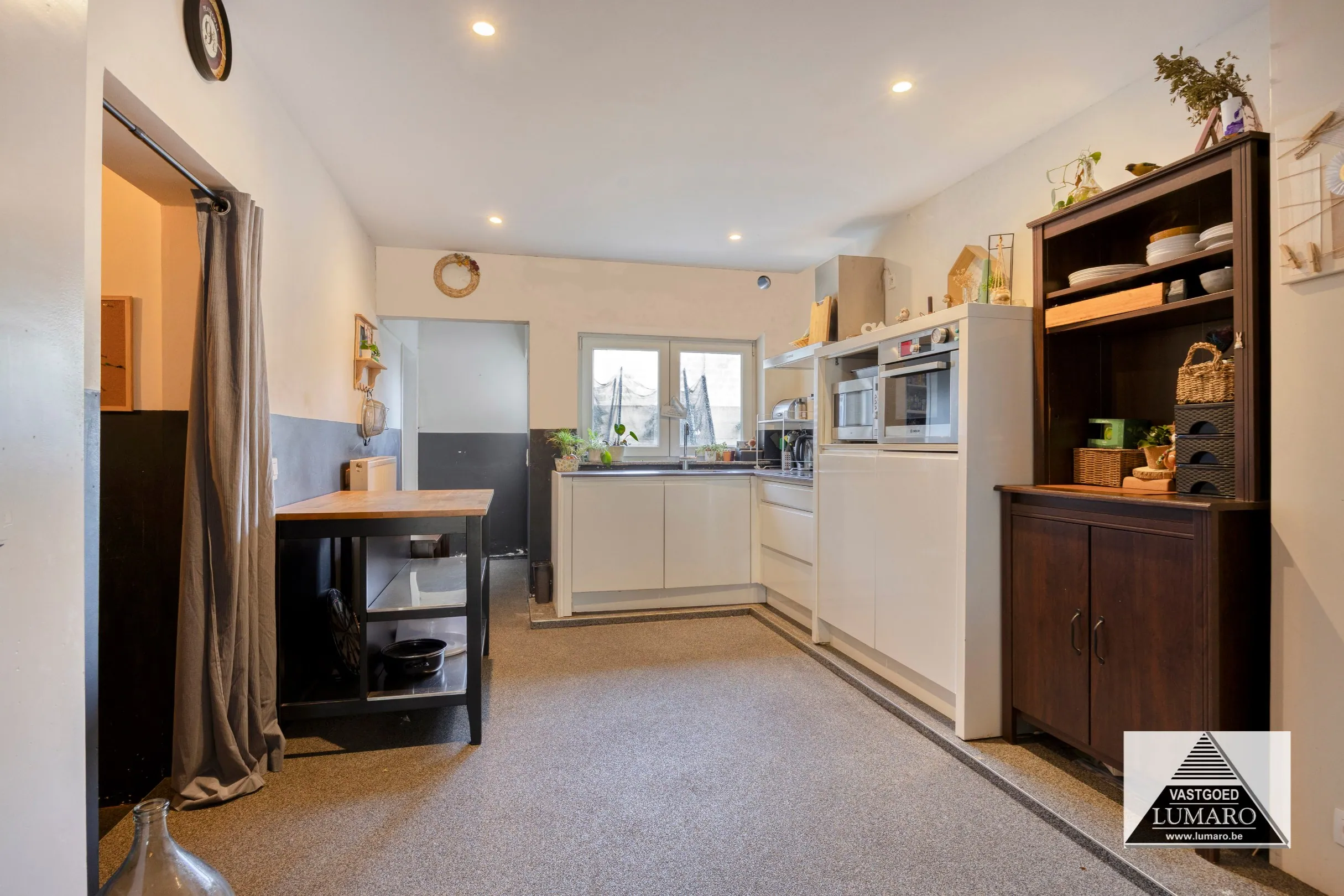 - Keuken : (4m x 3,09m = 12,36 m²) - steentapijt - volledig ingerichte open keuken (2017) met oven - koelkast - fornuis - dampkap.