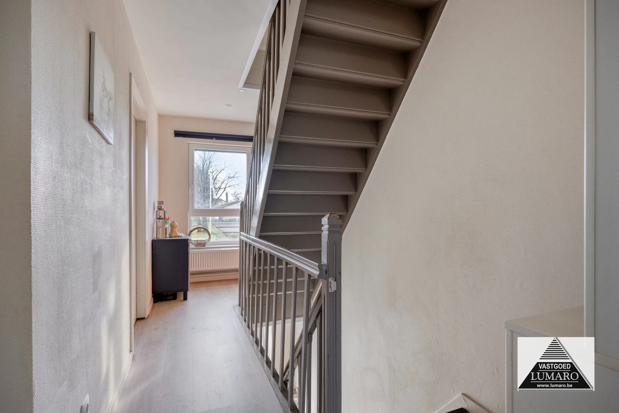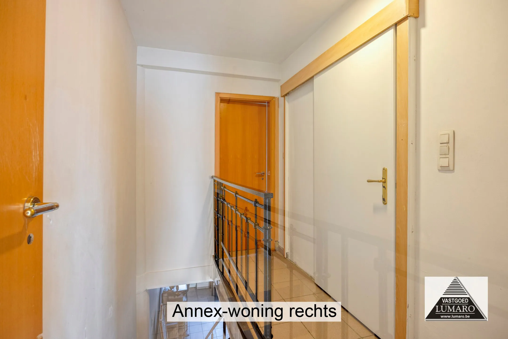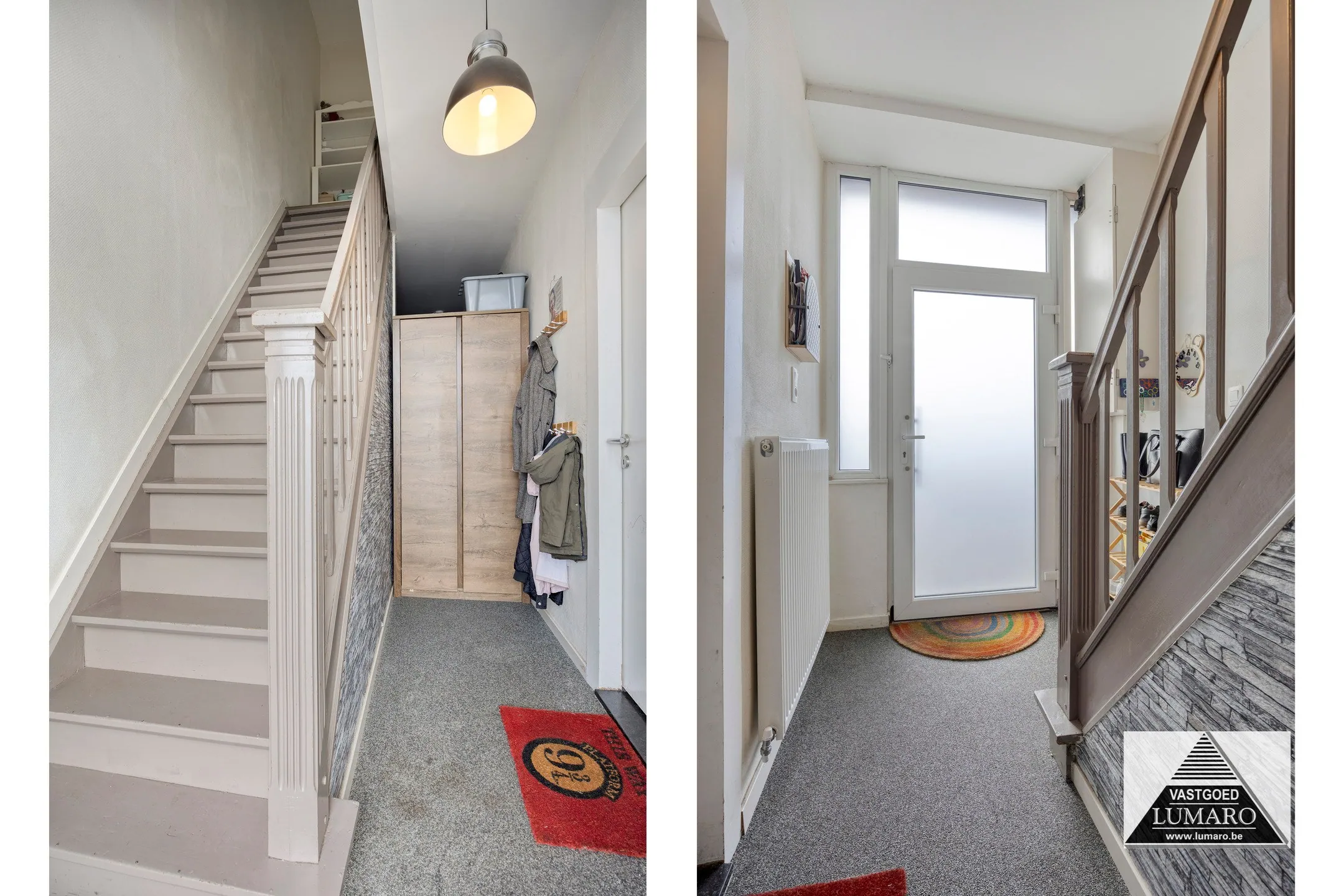 - Inkom: (1,86m x 1,84m = 3,42 m²) - steentapijt - ruime inkomhal met houten trap naar de verdieping.