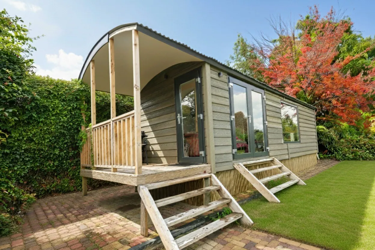 • een volledig ingerichte, vergunde chalet / pipowagen op ca. 20 meter van de woning