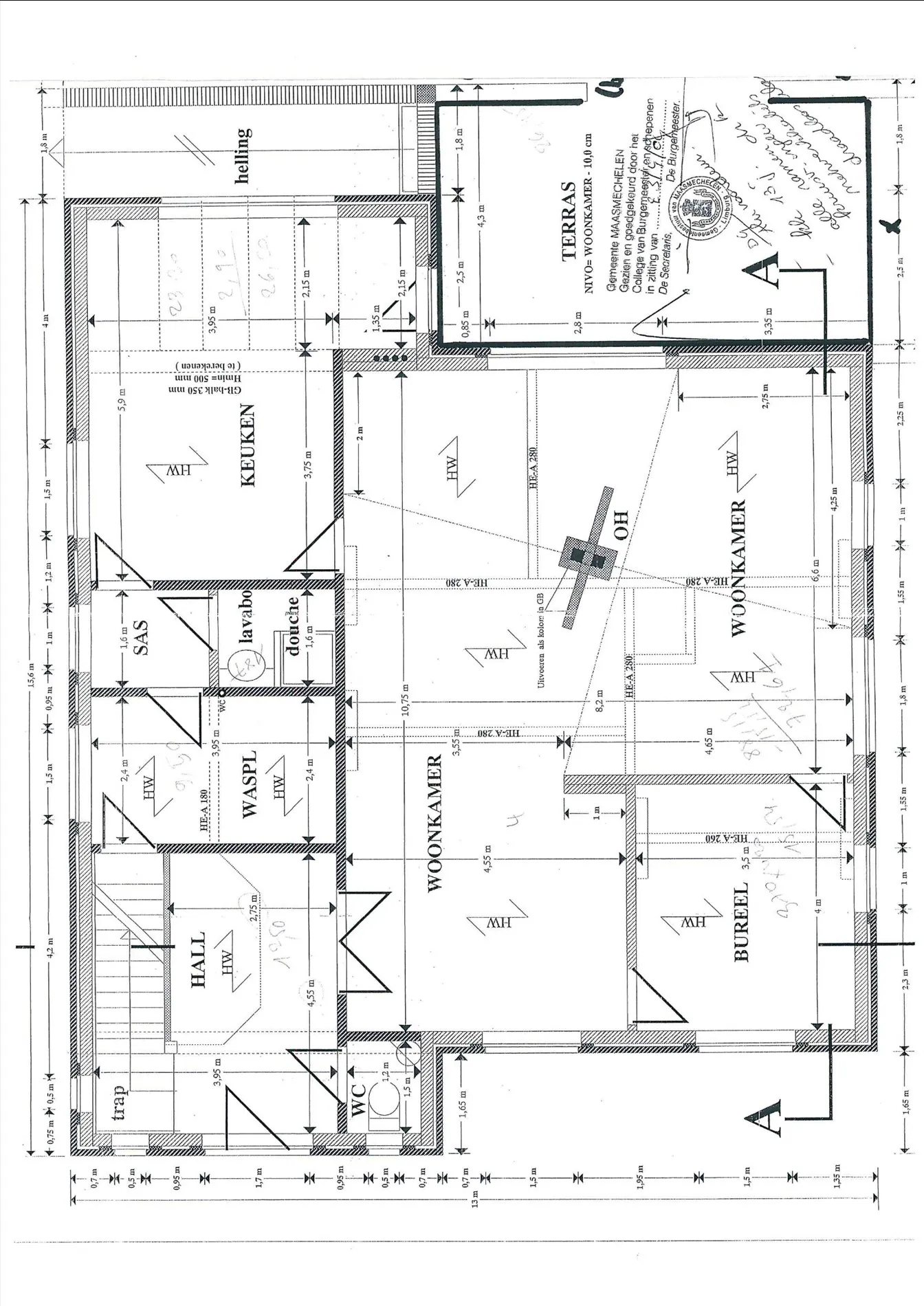 - Bureel: (3,50 m x 4,00 m = 15,54 m²) – tegelvloer - inbouwkasten,