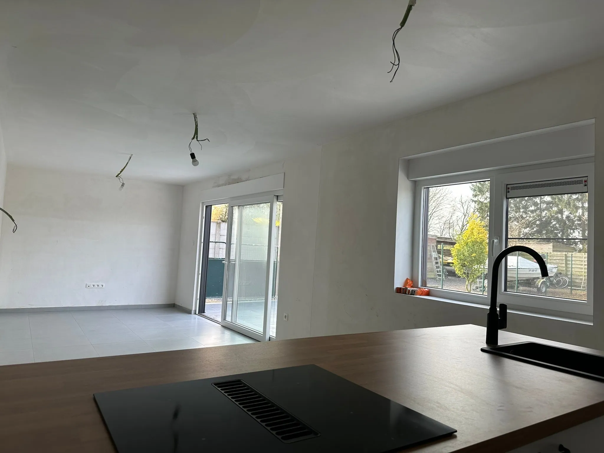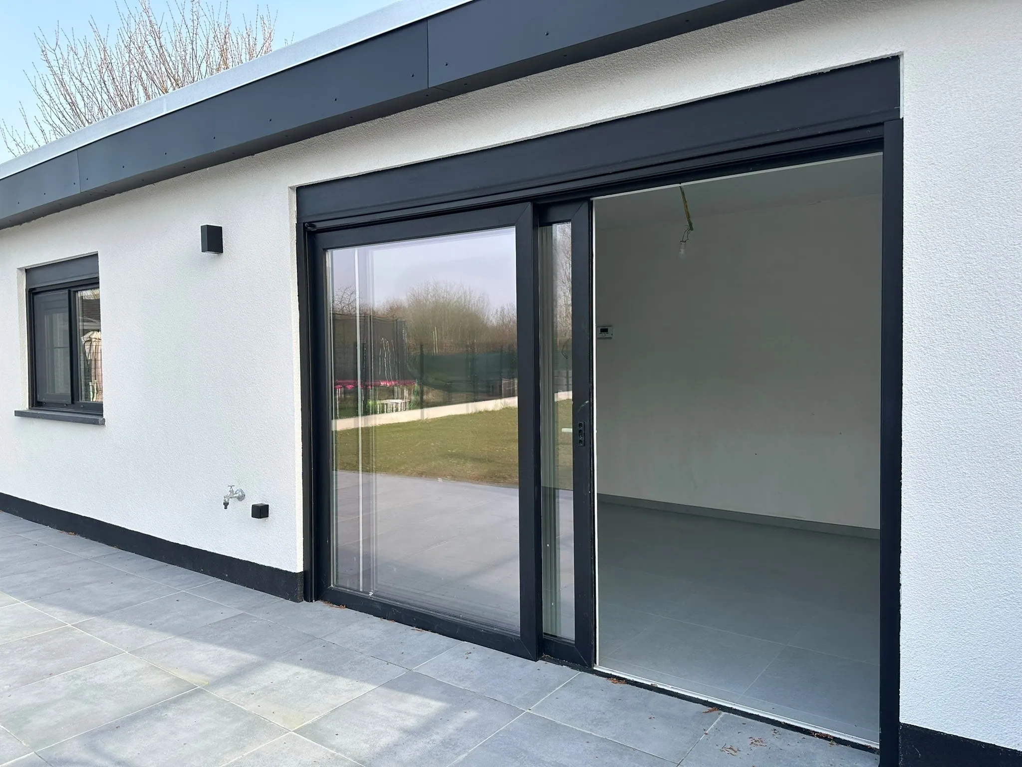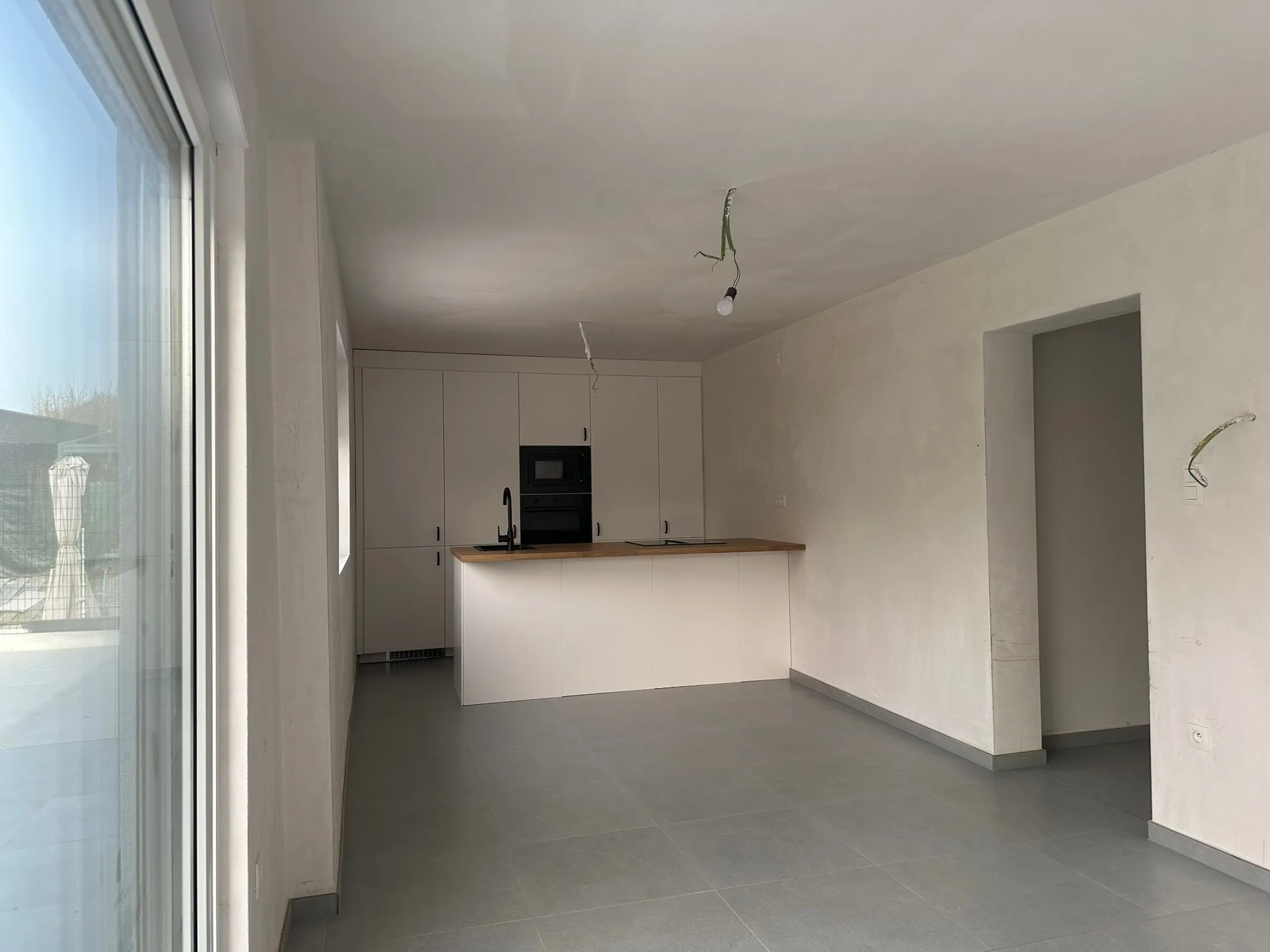 Aansluitend op de woonkamer met open keuken is er via schuifpui een terras over heel de breedte van de woning.