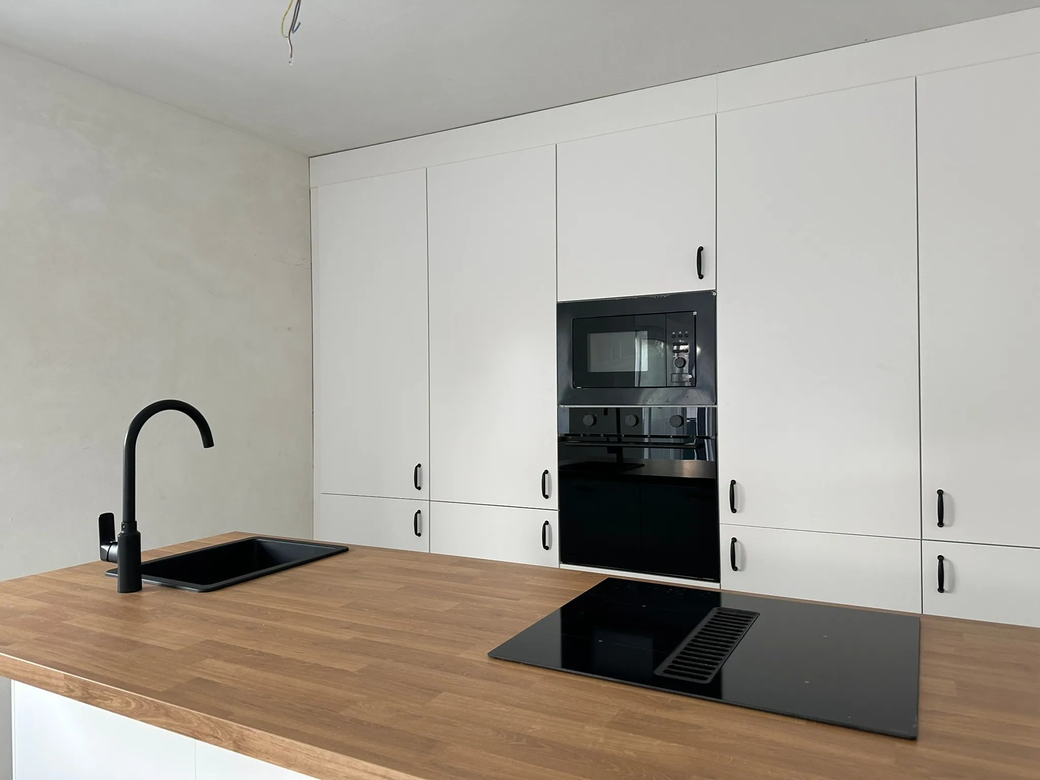 - Leefruimte met open keuken: (9,94 m x 3,00 m = 30 m²) - tegelvloer – raam en schuifpui naar terras en tuin – de nieuwe keuken wordt eerstdaags ingericht met kastenwand en eiland – 2 ovens - maatwerkblad eikenpatroon / laminaat – inductiekookplaat met geïntegreerde afzuigkap spoelbak in zwart kwartscomposiet