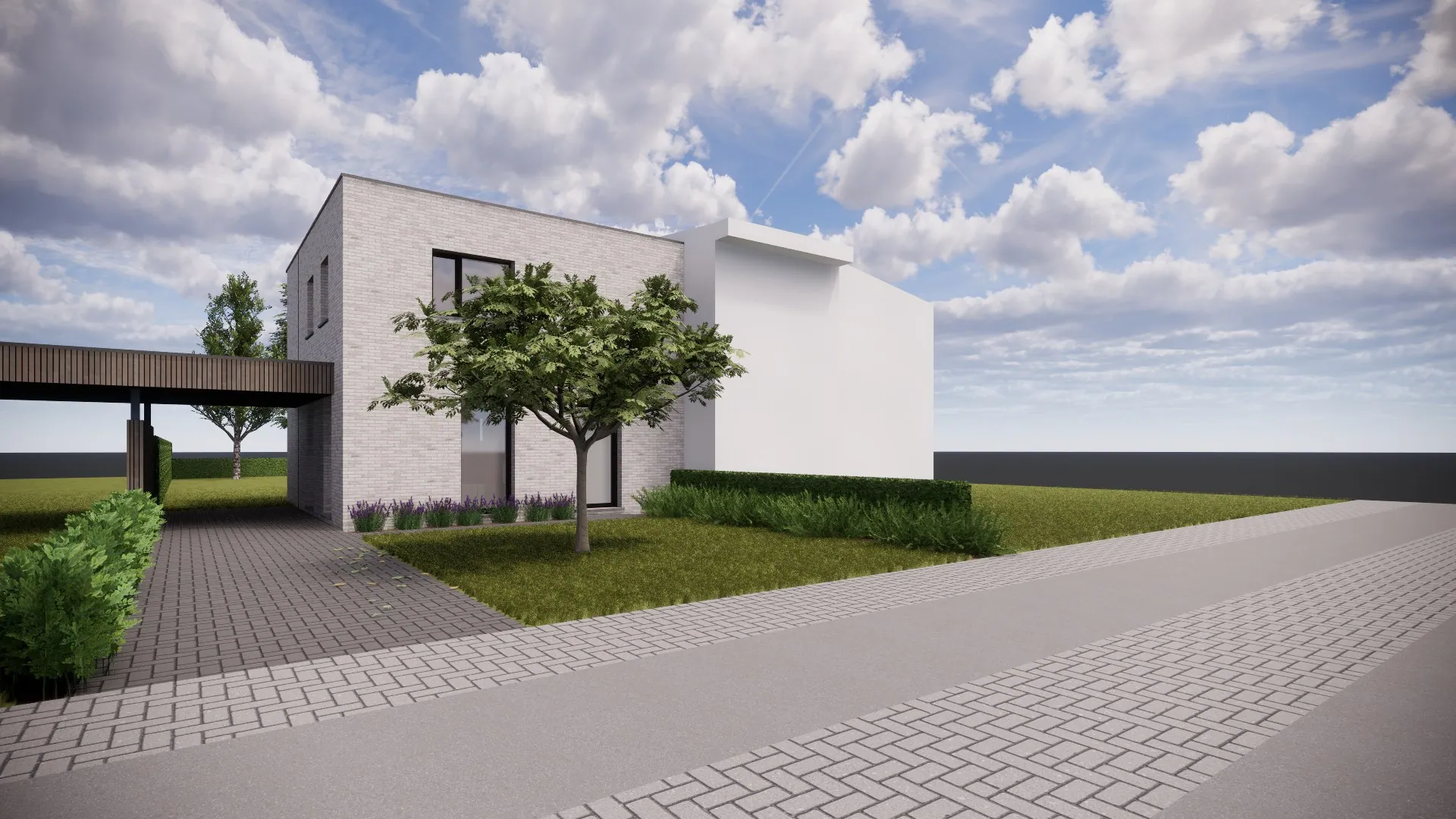 -Toegang tot de carport, oppervlak onder de carport worden verhard met waterdoorlatende betonklinkels, evenals het pad naar de voordeur